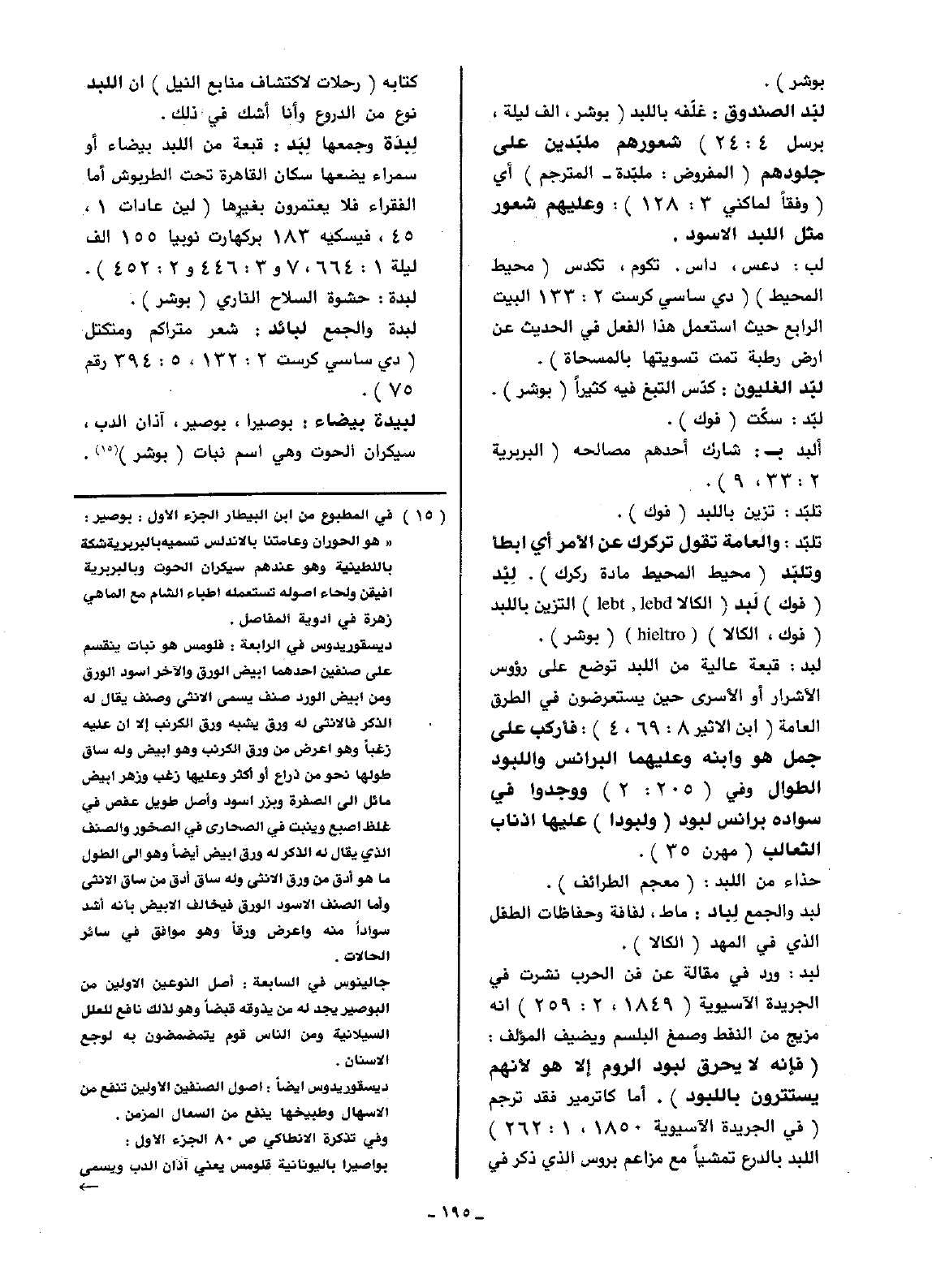 لبد: ورد في مقالة عن فن الحرب نشرت في الجريدة الآسيوية (1849، 259:2) إنه مزيج من النفط وصمغ البلسم ويضيف المؤلف: (فإنه لا يحرق لبود الروم إلا هو لأنهم يستترون باللبود). أما كاترمير فقد ترجم (في الجريدة الآسيوية 1850، 262:1) اللبد بالدرع تمشياً مع مزاعم بروس الذي ذكر في كتابه رحلات لاكتشاف منابع النيل) أن اللبد نوع من الدروع وأنا أشك في ذلك.