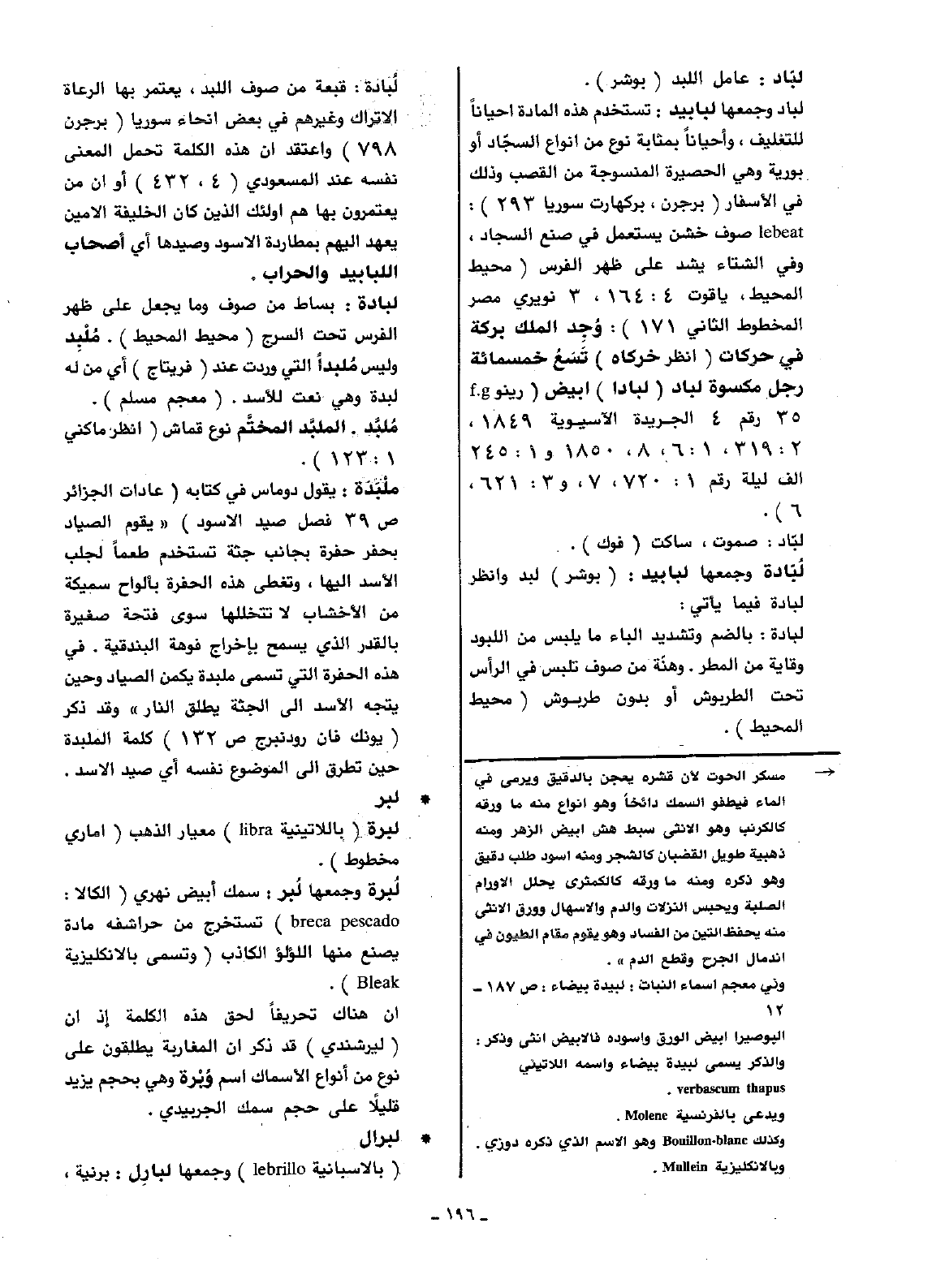 لباد وجمعها لبابيد: تستخدم هذه المادة أحياناً للتغليف، وأحياناً بمثابة نوع من أنواع السجّاد أو بورية وهي الحصيرة المنسوجة من القصب وذلك في الأسفار (برجرن، بركهات سوريا 293: lebeat صوف خشن يستعمل في صنع السجاد، وفي الشتاء يشد على ظهر الفرس (محيط المحيط، ياقوت 164:4، 3 نويري مصر المخطوط الثاني 171): وُجِد الملك بركة في حركات (انظر خركاه) تَسَعُ خمسمائة رجل مكسوة لباد (لبادا ابيض (رينو f. g 35 رقم الجريدة الآسيوية 1849، 319:2، 6:1، 8، 1850و 245:1 ألف ليلة رقم 720:1، 7، و621:3، 6).