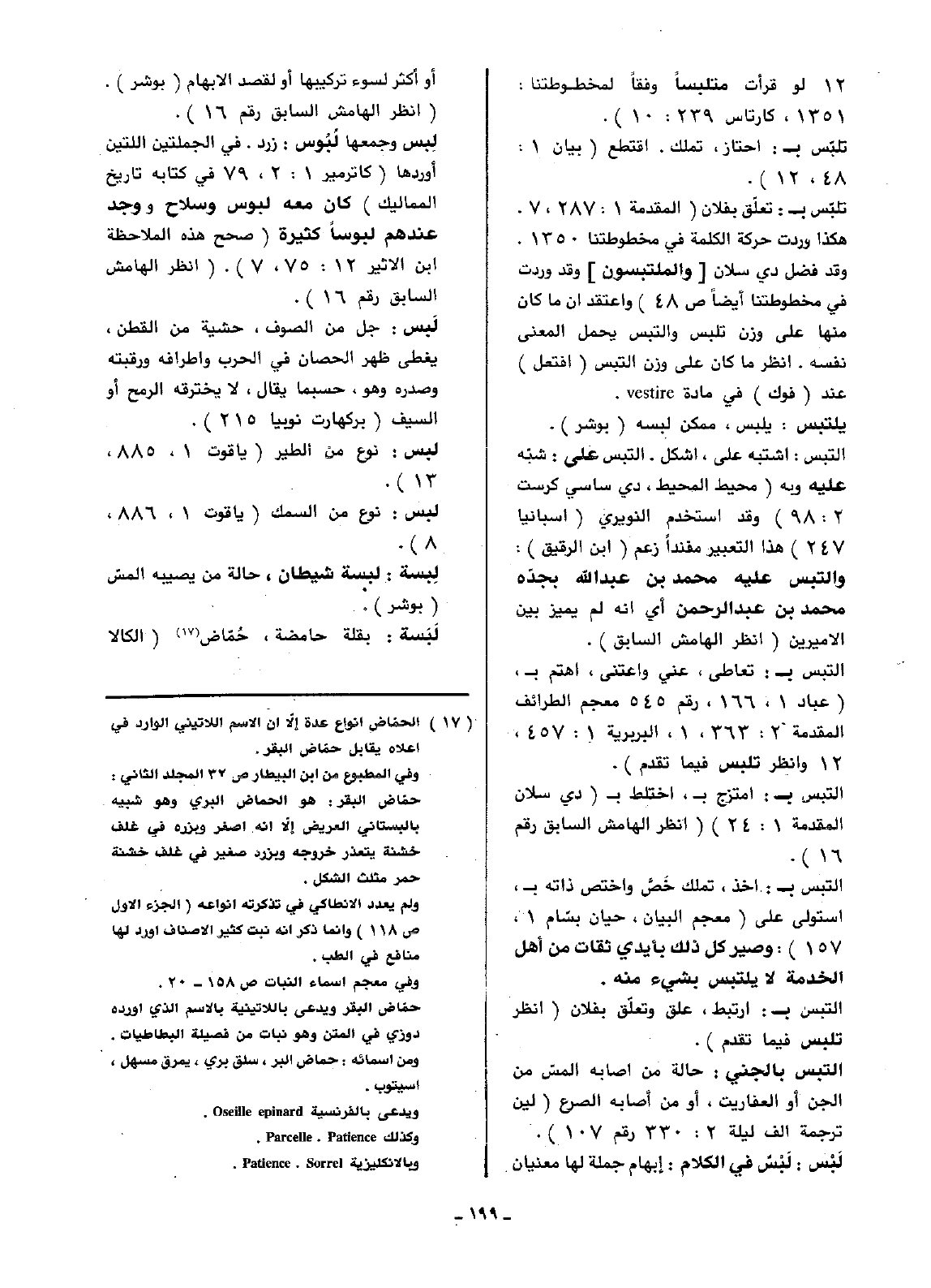 تلبّس ب: تعلّق بفلان (المقدمة 287:1، 7. هكذا وردت حركة الكلمة في مخطوطتنا 1350. وقد فضل دي سلان [والملتبسون] وقد وردت في مخطوطتنا أيضاً ص48). وأعتقد أن ما كان منها على وزن تلبس والتبس يحمل المعنى نفسه. انظر ما كان على وزن التبس (افتعل) عند (فوك) في مادة vestire.