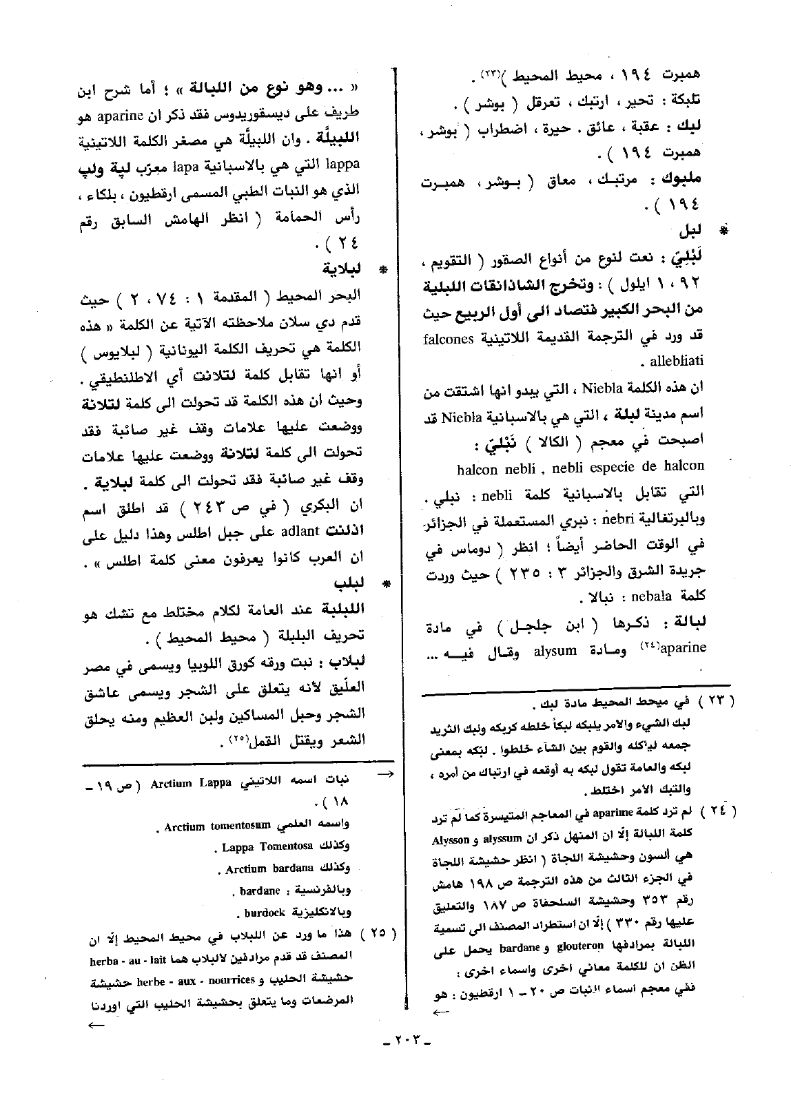 لبالة: ذكرها (ابن جلجل) في مادة aparine ومادة alysum وقال فيه. ( ... وهو نوع من اللبالة)؛ أما شرح ابن طريف على ديسقوريدوس فقد ذكر أن aparine هو اللبيلَّة. وإن اللبيلَّة هي مصغر الكلمة اللاتينية lappa التي هي بالأسبانية lapa معرّب لبة ولب الذي هو النبات الطبي المسمى ارقطيون، بلكاء، رأس الحمامة (انظر الهامش السابق رقم 24).