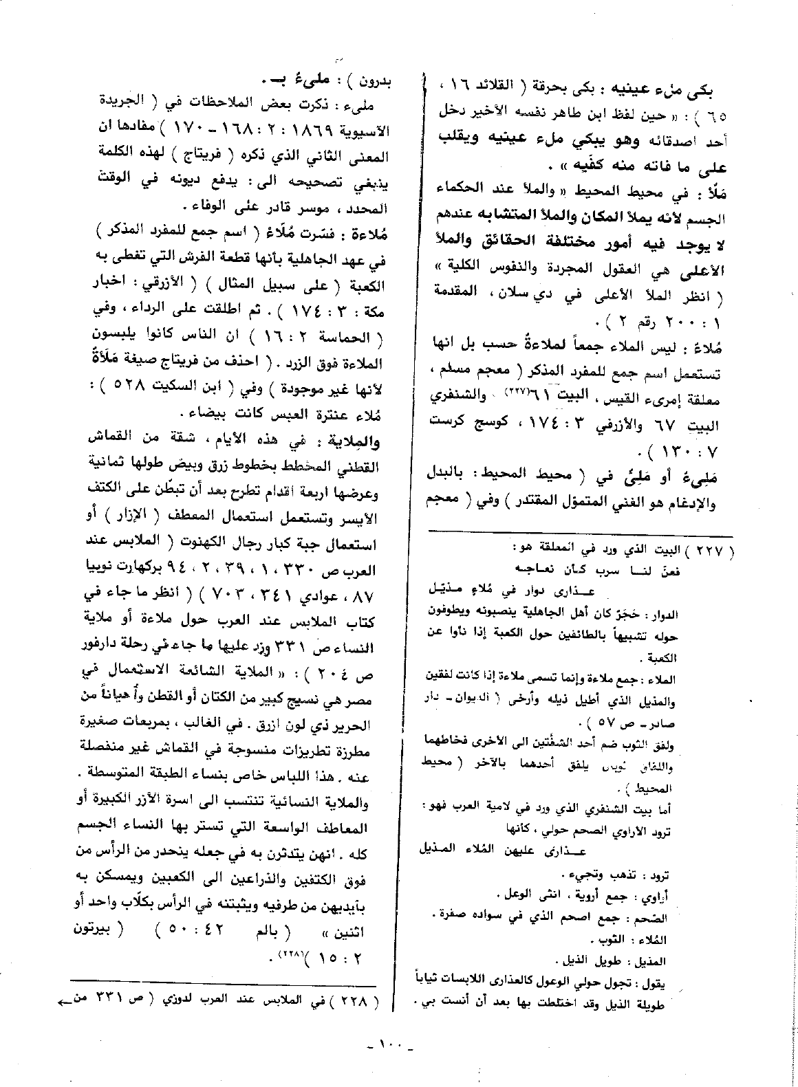 ملاء: ليس الملاء جمعا لملاءة حسب بل إنها تستعمل اسم جمع للمفرد المذكر (معجم مسلم، معلقة امرئ القيس، البيت 61، والشنفري البيت 67 والازرقي 3: 174، كوسج كرست 7: 130).