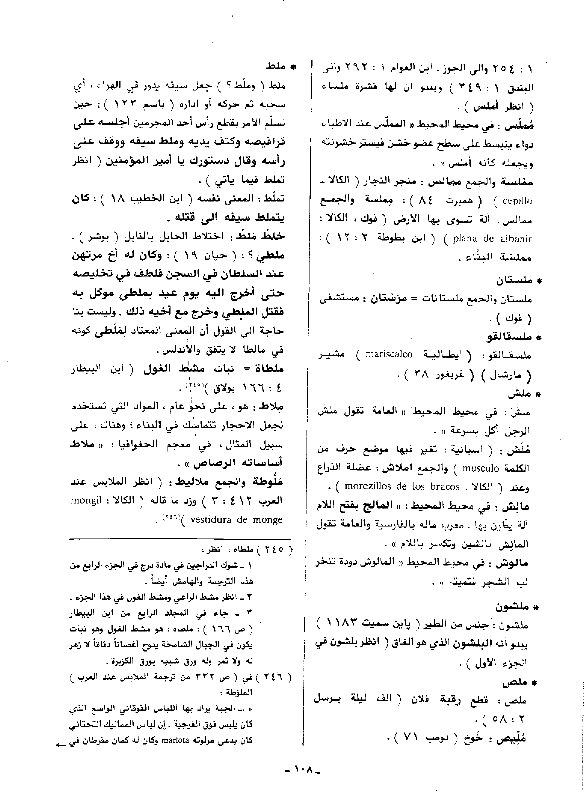 • ملشون: ملشون: جنس من الطير (باين سميث 1183) يبدو انه البلشون الذي هو الغاق (انظر بلشون في الجزء الأول).