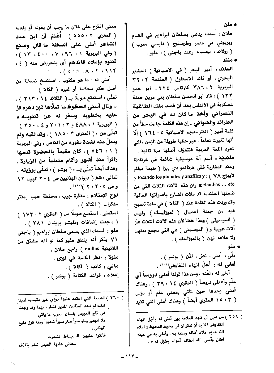 • ملند: الملند: أمير البحر (في الأسبانية) المشير البحري، أو قائد الأسطول (المقدمة 2: 32 البربرية 2: 386 كارتاس 224، أبو حمو 133): قاد أبو الحسن سلطان بني مرين حملة عسكرية بعد أن فسد ملند الطاغية النصراني وأخذ ما كان له في البحر من الطرائد والشواني. إن هذه الكلمة جاءت حقا من كلمة أمير (انظر معجم الأسبانية 5: 164) إلا أنها تغيرت تماما، عبر حقبة طويلة من الزمن، لكي تعود اللغة العربية فتتعرف أصلها مرة ثانية.