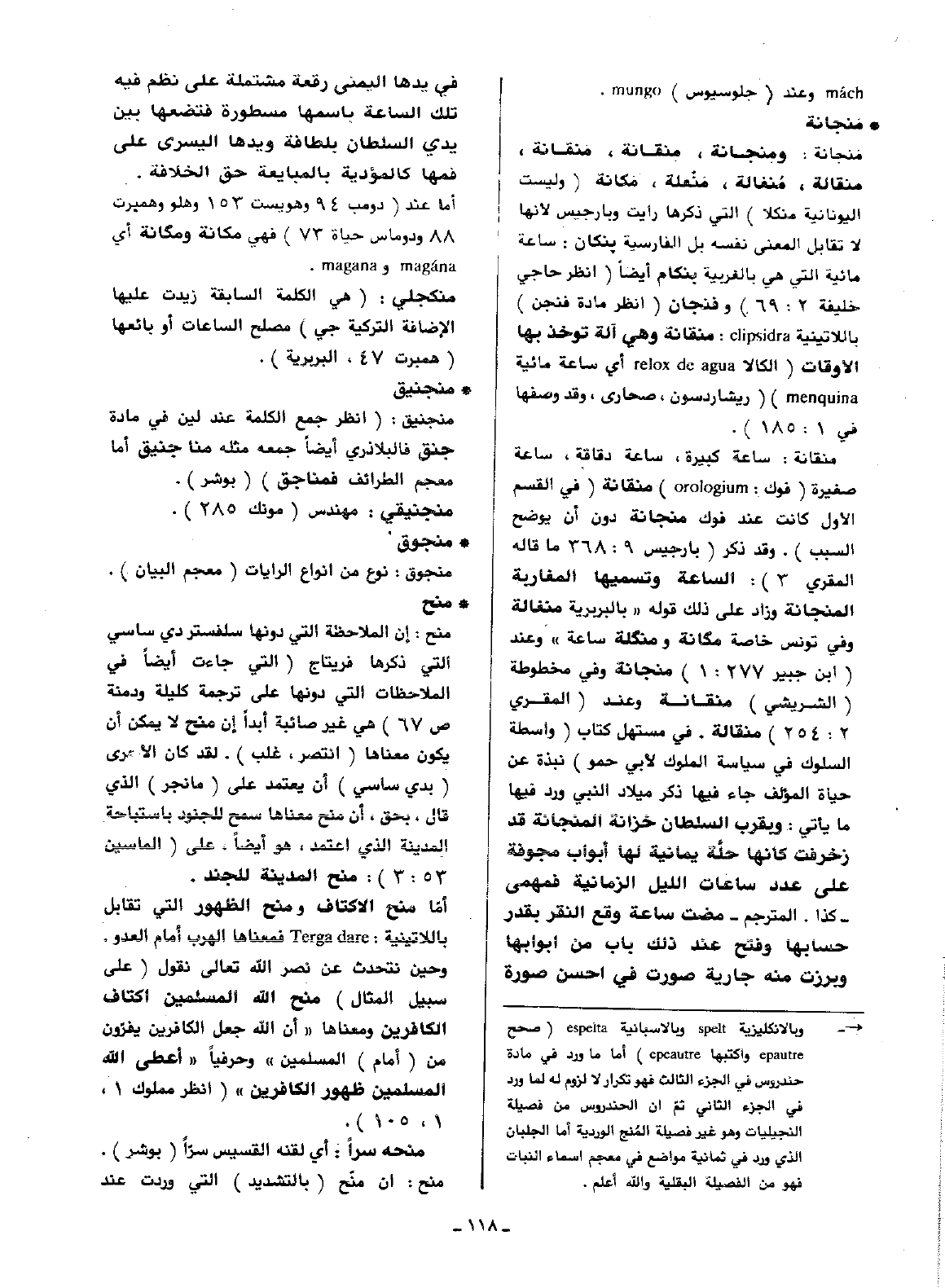منجانة: ومنجانة، منقانة، منقانة، منقالة، منغالة، منعلة، مكانة (وليست اليونانية منكلا) التي ذكرها رايت وبارجيس لأنها لا تقابل المعنى نفسه بل الفارسية بنكان: ساعة مائية التي بالغربية بنكام أيضا (انظر حاجي خليفة 2: 69) وفنجان (انظر مادة فنجن) باللاتينية clipsidra: منقاتة وهي آلة تؤخذ بها الأوقات (الكالا relox de agua أي ساعة مائية menquina) ( ريتشاردسون، صحارى، وقد وصفها في 1: 185).
