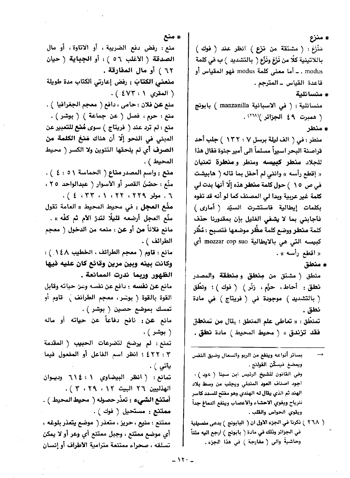 • منزع: منزع: (مشتقة من نزع) انظر عند (فوك) باللاتينية كلا من نزع ونزع (بالتشديد) ب في كلمة modus. أما معنى كلمة modus فهو المقياس أو قاعدة القياس -المترجم.