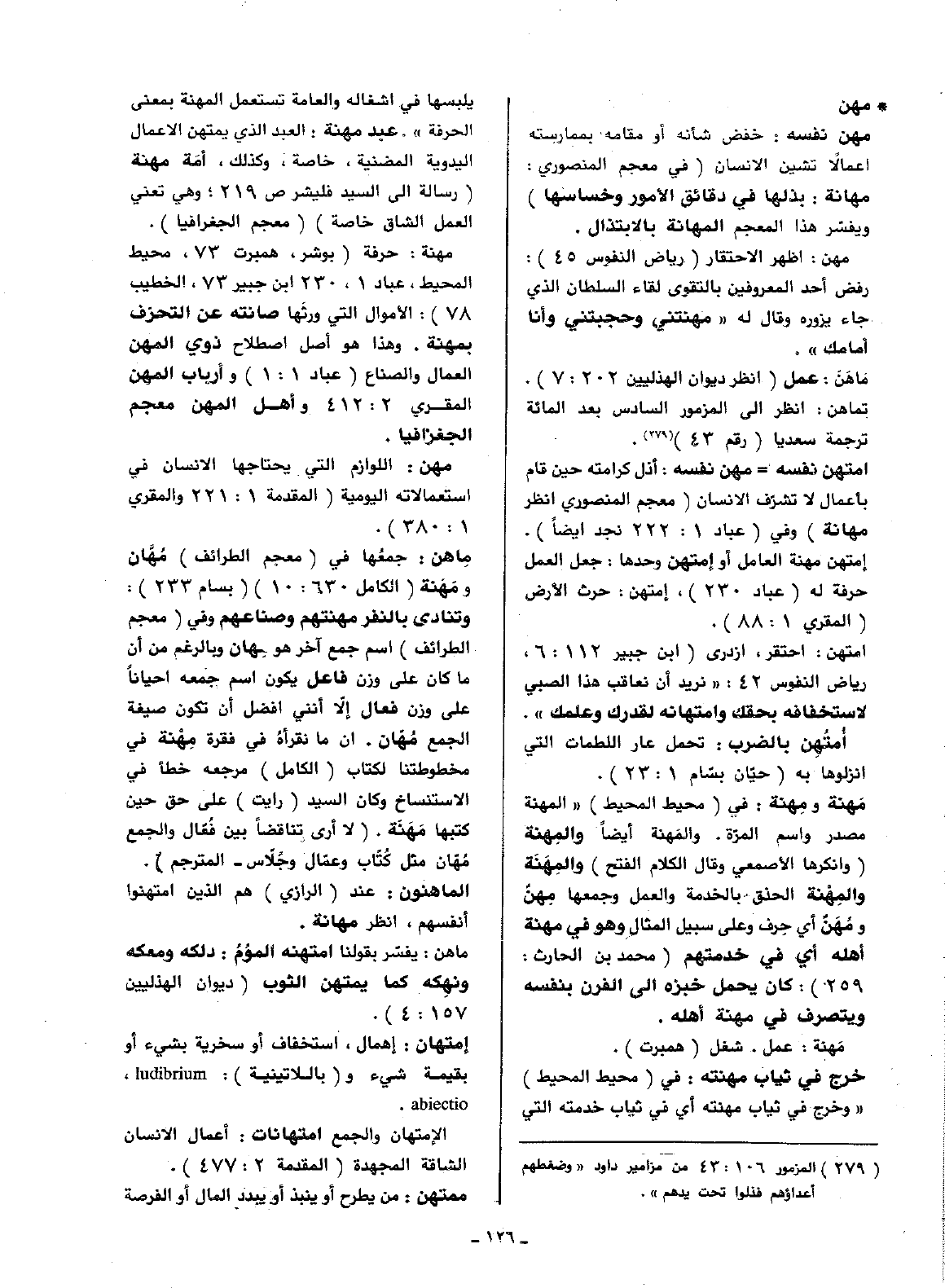 ماهن: جمعها في (معجم الطرائف) مهان ومهنة (الكامل 630: 10) (بسام 233): وتنادى بالنفر مهنتهم وصناعتهم وفي (معجم الطرائف) اسم جمع آخر هو مهان وبالرغم من أن ما كان على وزن فاعل يكون اسم جمعه أحيانا على وزن فعال إلا أنني أفضل أن تكون صيغة الجمع مهان. أن ما نقرأه في فقرة مهنة في مخطوطتنا لكتاب (الكامل) مرجعه خطأ في الاستنساخ وكان السيد (رايت) على حق حين كتبها مهنة. (لا أرى تناقضا بين فعال والجمع مهان مثل كتاب وعمال وجلاس -المترجم).
