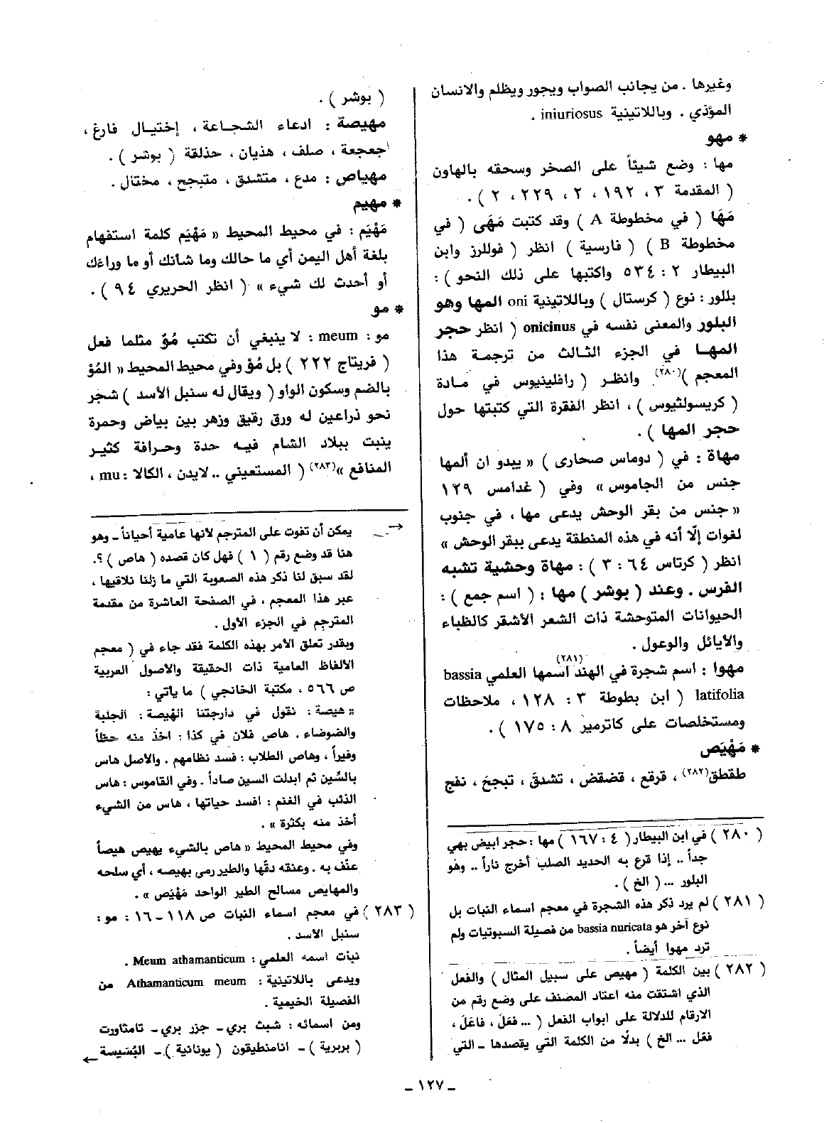 • مو: مو: meum: لا ينبغي أن تكتب مو مثلما فعل (فريتاج 222) بل مو وفي محيط المحيط (المو بالضم وسكون الواو (ويقال له سنبل الأسد) شجر نحو ذراعين له ورق رقيق وزهر بين بياض وحمرة ينبت ببلاد الشام فيه حدة وحرافة كثير المنافع) (المستعيني .. لايدن، الكالا: mu،