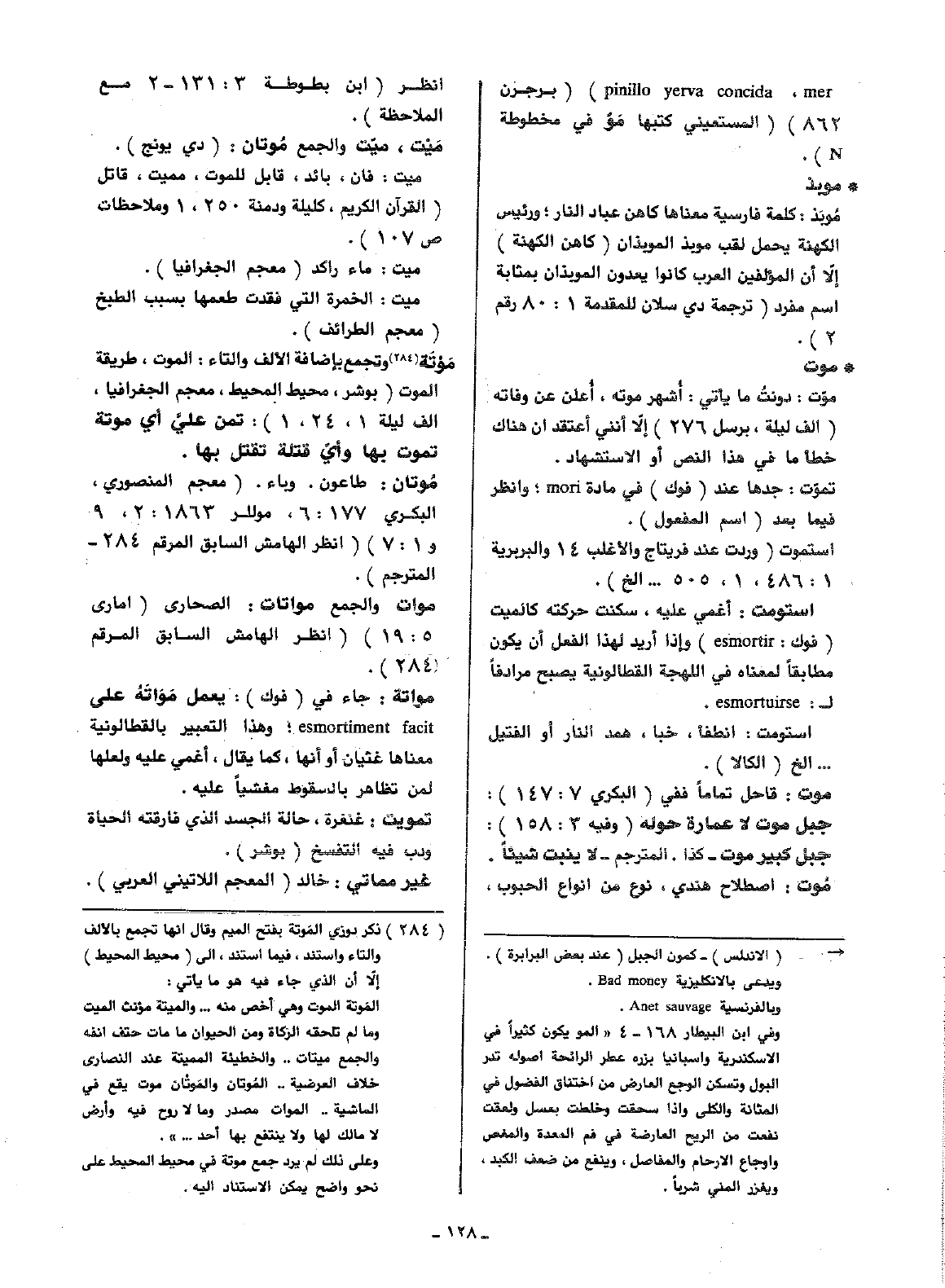 • موت: موت: دونت ما يأتي: أشهر موته، أعلن عن وفاته (ألف ليلة، برسل 276) إلا أنني اعتقد أن هناك خطأ ما في هذا النص أو الاستشهاد.