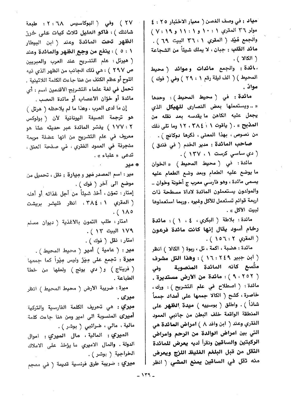 مائدة: (اصطلاح في علم التشريح): ورك، خاصرة، كشح (الكالا جمعها على امداد جمعا شاذا). وأطلق (بوسييه) ميدة الظهر على المنطقة الواقعة خلف البطن من جانبي العمود الفقري وعند (ابن وافد 8) أمراض المائدة هي التي بين أمراض الوالدة من الرحم وأمراض الركبتين والساقين ونقرأ لديه يعرض للمائدة الثقل من قبل البلغم الغليظ اللزج ويعرض منه ثقل في الساقين يمنع النشي (انظر 27) وفي (البوكاسيس 68:2 طبعة شانتك): فاكو العليل ثلاث كيات على خرز الظهر تحت المائدة وعند (ابن البيطار 1: 5): ينفع من وجع الظهر والمائدة وعند (هيرتل: علم التشريح عند العرب والعبريين ص297): هي ذلك الجانب من الظهر الذي فيه اللوح أو عظم الكتف من هنا جاءت الكلمة اللاتينية. تحمل في لغة علماء التشريح الأقدمين اسم: أي مائدة أو خوان الأعصاب أو مائدة العصب.