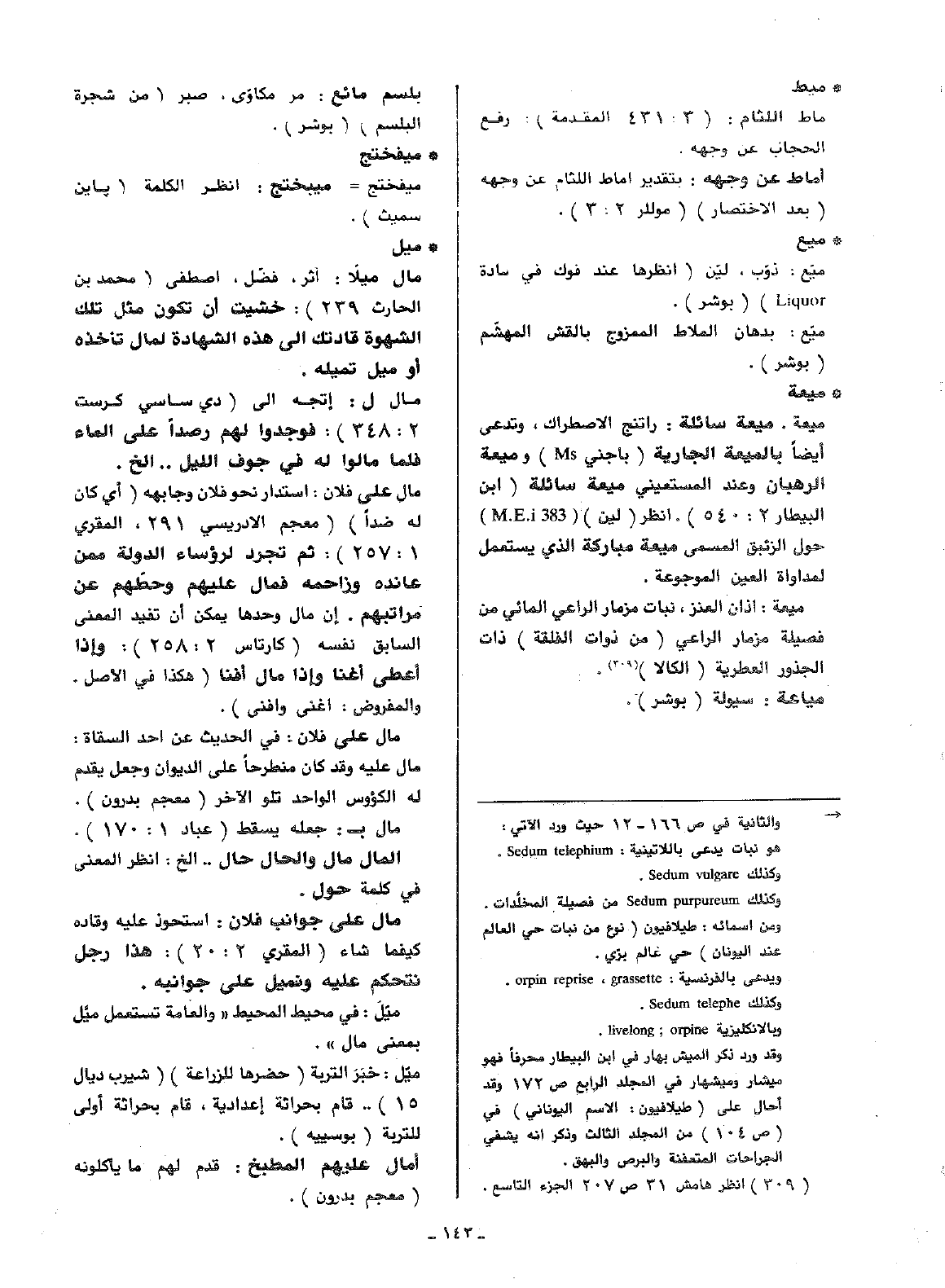 • ميعة: ميعة. ميعة سائلة: راتنج الاصطراك، وتدعى أيضا بالميعة الجارية (باجني Ms) وميعة الرهبان وعند المستعيني ميعة سائلة (ابن البيطار 2: 540). انظر (لين) ( M.E.i 383) حول الزئبق المسمى ميعة مباركة الذي يستعمل لمداواة العين الموجوعة.
