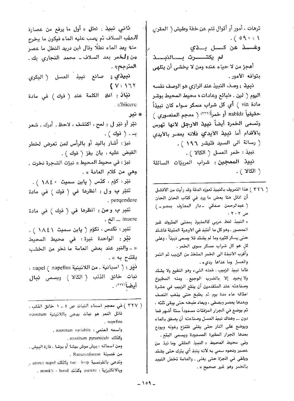 نبيذ: وصف النبيذ عند الرازي هو الوصف نفسه اليوم (لين، طبائع وعادات، محيط المحيط بوشر مادة vin) أي كل شراب مسكر سواء كان نبيذا حقيقيا nabidz أو خمرا (معجم المنصوري) وتسمى الخمرة أيضا نبيذ الأرجل لأنها تهرس بالأقدام أما نبيذ الأيدي فلأنه يعصر بالأيدي (رسالة إلى السيد فليشر 196).