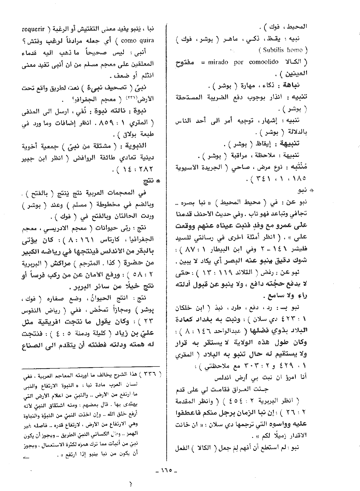 نبو: لم أستطع أن أفهم لم جعل (الكالا) الفعل نبا، ينبو يفيد معنى التفتيش أو الرغبة ( como quira requerir) أي جعله مرادفا لرغب وفتش؟ أنبي: ليس صحيحا ما ذهب إليه قدماء المعلقين على معجم مسلم من أن أنبي تفيد معنى انثلم أو ضعف.