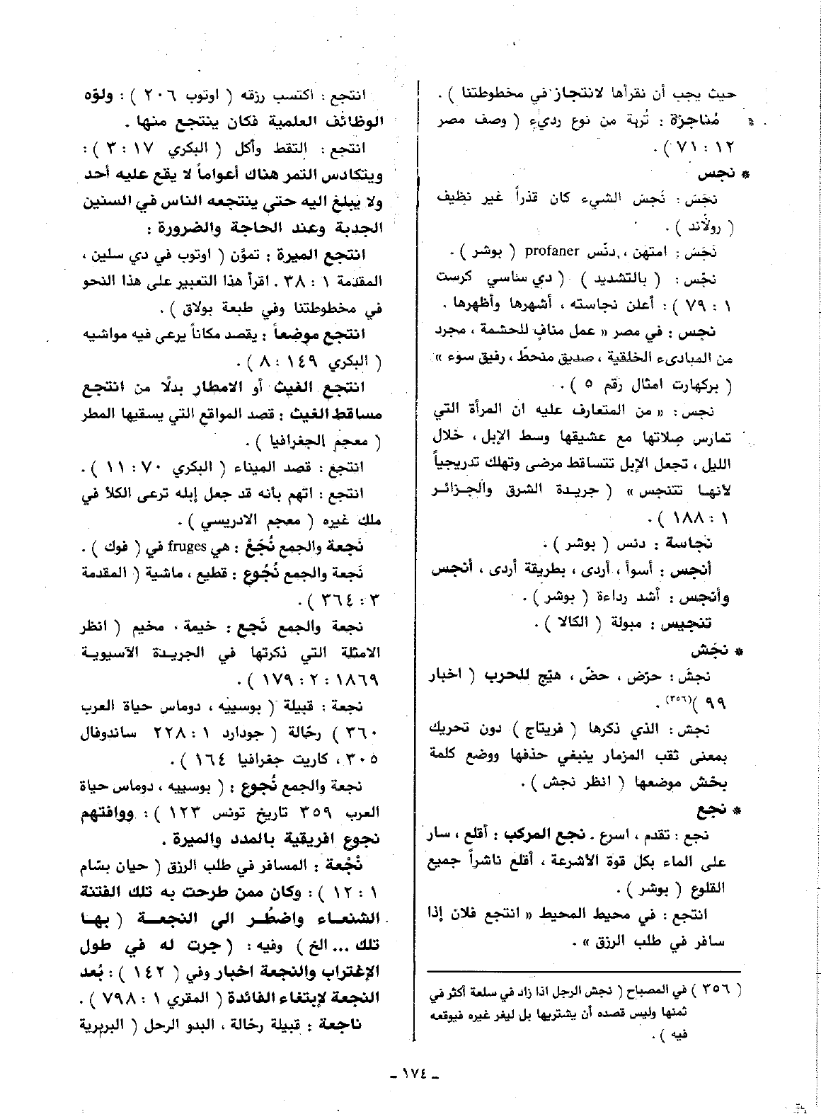انتجع: التقط وأكل (البكري 17: 3): ويتكادس التمر هناك أعواما لا يقع عليه أحد ولا يبلغ إليه حتى ينتجعه الناس في السنين الجدبة وعند الحاجة والضرورة: انتجع الميرة: تمون (اوتوب في دي سلين، المقدمة 1: 38. اقرأ التعبير على هذا النحو في مخطوطتنا وفي طبعة بولاق).