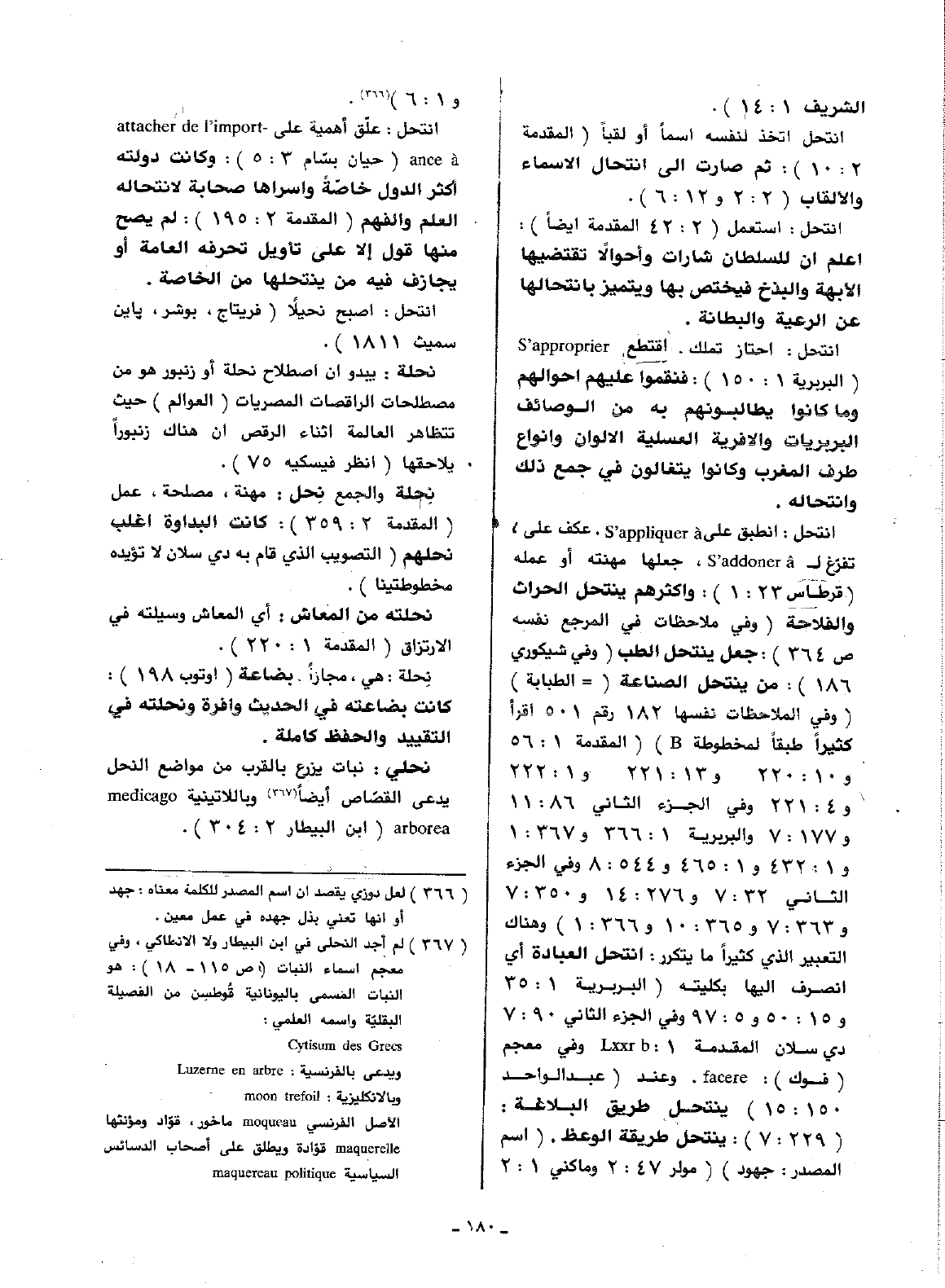 انتحل: انطبق على S'appliquer. عكف على، تفرغ ل S'addoner a، جعلها مهنته أو عمله (قرطاس 23: 1): وأكثرهم ينتحل الحراث والفلاحة (وفي ملاحظات في المرجع نفسه ص364): جعل ينتحل الطب (وفي شيكوري 186): من ينتحل الصناعة (= الطبابة) (وفي الملاحظات نفسها 182 رقم 501 اقرأ كثيرا طبقا لمخطوطة B) ( المقدمة 1: 56 و 10: 220 و13: 221 و1: 222 و4: 221 وفي الجزء الثاني 86: 11 و177: 7 والبربرية 1: 366 و367: 1 و1: 432 و1: 465 و544: 8 وفي الجزء الثاني 32: 7 و276: 14 و350: 7 و363: 7 و365: 10 و366: 1) وهناك التعبير الذي كثيرا ما يتكرر: انتحل العبادة أي انصرف إليها بكليته (البربرية 1: 35 و15: 50 و5: 97 وفي الجزء الثاني 90: 7 دي سلان المقدمة 1: Lxxr b وفي معجم 150: 15) ينتحل طريق البلاغة: (229: 7): ينتحل طريقة الوعظ. (اسم المصدر: جهود) (مولر 47: 2 وماكني 1: 2 و1: 6).