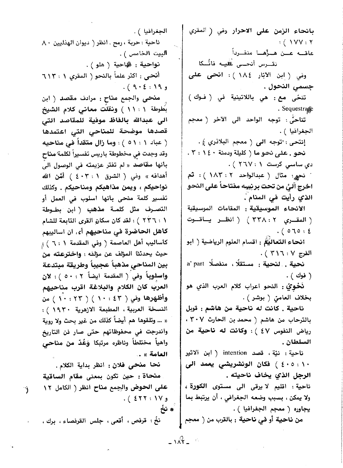 منحى والجمع مناح: مرادف مقصد (ابن بطوطة 1: 11) ونقلت معاني كلام الشيخ إلى عبد الله بألفاظ موفية للمقاصد التي قصدها موضحة للمناحي التي اعتمدها (عباد 1: 51): وما زال متقدا في مناحيه وقد وجدت في مخطوطة باريس تفسيرا لكلمة مناح بأمها مقاصد (لم تفتر عزيمته في الوصول إلى أهدافه: وفي (الشرق 1: 403) أمن الله نواحيكم، ويمن مذاهبكم ومناحيكم. وكذلك تفسير كلمة منحى بأنها أسلوب في العمل أو التصرف مثل كلمة مذهب (ابن بطوطة 1: 236): لقد كان سكان القرى التابعة للشام كأهل الحاضرة في مناحيهم أي أن أساليبهم كأساليب أهل العاصمة (وفي المقدمة 1: 6): حيث يحدثنا المؤلف عن مؤلفه: واخترعته من بين المناحي مذهبا عجيبا وطريقة مبتدعة وأسلوبا وفي (المقدمة أيضا 2: 50): لأن العرب كان الكلام والبلاغة أقرب مناحيهم وأظهرها وفي (43: 10) (23: 10) من النسخة العربية، المطبعة الأزهرية 1930): ( .. وتلقوها هم أيضا كذلك من غير بحث ولا روية واندرجت في محفوظاتهم حتى صار فن التاريخ واهيا مختلطا وناظره مرتبكا وعد من مناحي العامة).