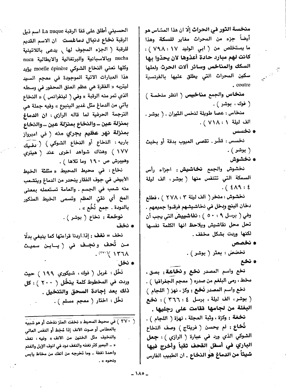 نخاع: لم يحسن (فريتاج) وصف النخاع الشوكي الذي ورد في عبارة (الرازي): جعل الباري في اسفل القحف ثقبا واخرج فيها شيئا من الدماغ هو النخاع. إن الطبيب الفارس الحسيني أطلق على قفا الرقبة La nuque اسم ذيل الرقبة نخاع دنبال دماغست أن الاسم القديم للرقبة (الجزء المجوف لها) يدعى باللاتينية nucha وبالأسبانية والإيطالية nuca وكلها تعني النخاع الشوكي moelle epinere يؤيد هذا العبارات الآتية الموجودة في معجم السيد ليتربه (الفقرة هي عظم العنق المحفور في وسطه الذي تمر منه الرقبة) وفي (لينفرانس) (النخاع يأتي من الدماغ مثل غدير الينبوع) وفيه جملة هي الترجمة الحرفية لما قاله الرازي: أن الدماغ بمنزلة عين -والنخاع بمنزلة عين- والنخاع بمنزلة نهر عظيم يجري منه (في امبرواز باريه: النخاع أو النخاع الشوكي) (دفيك 177) وهناك شواهد أخرى عند (هيتري وهيبرش ص190 وما تلاها).