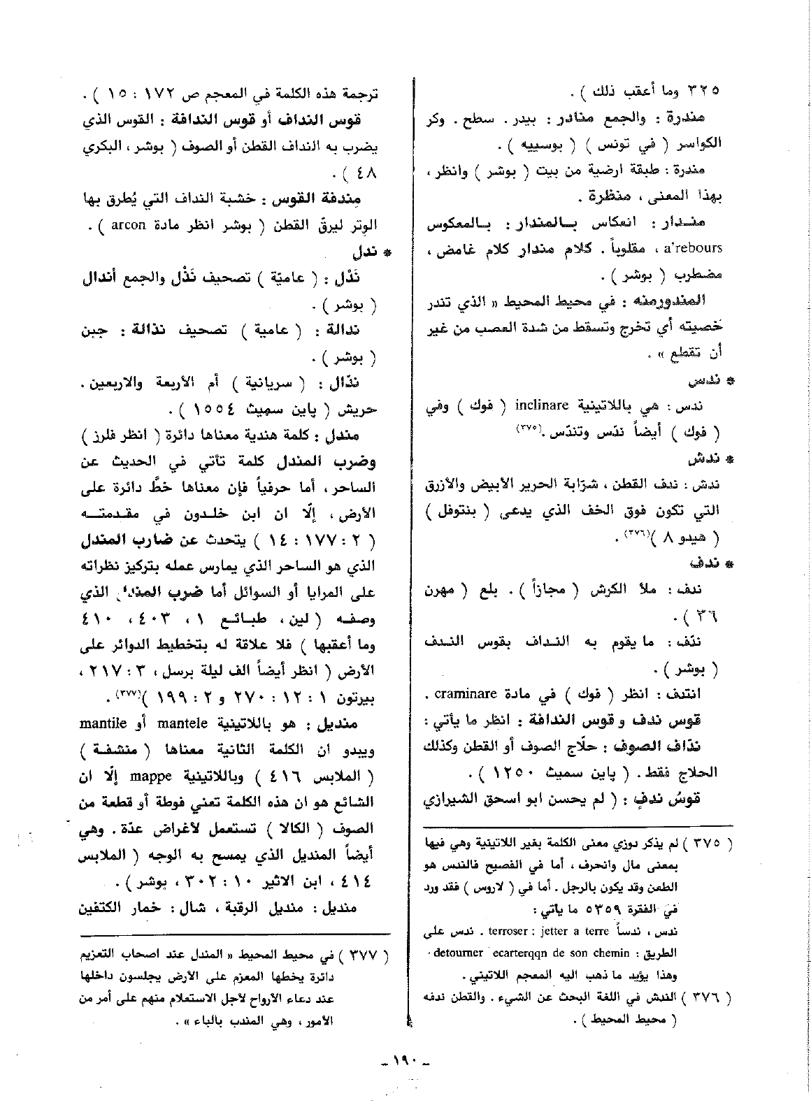 منديل: هو باللاتينية mantele أو mantile ويبدو أن الكلمة الثانية معناها (منشفة) (الملابس 416) وباللاتينية mappe إلا أن الشائع هو أن هذه الكلمة تعني فوطة أو قطعة من الصوف (الكالا) تستعمل لأغراض عدة. وهي أيضا المنديل الذي يمسح به الوجه (الملابس 414، ابن الأثير 10: 302، بوشر).