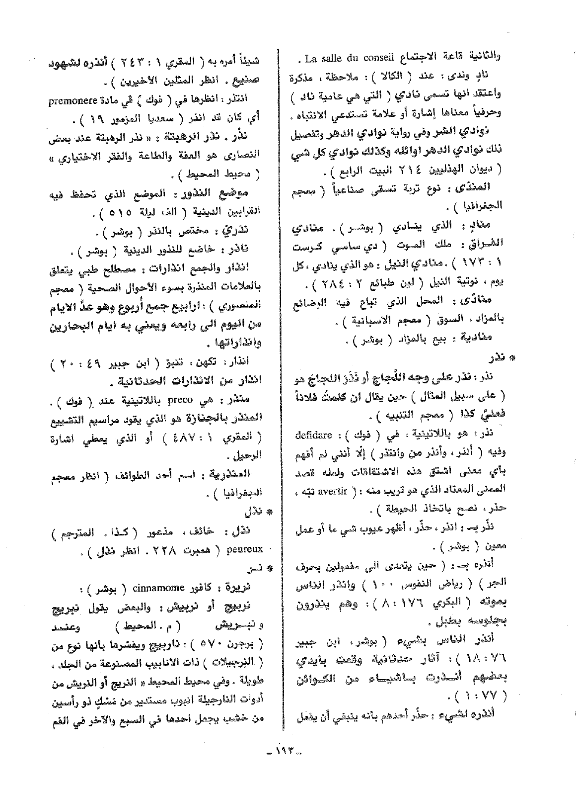 نذر: هو باللاتينية، في (فوك): defidare وفيه (انذر، وانذر من وانتذر) إلا أنني لم أفهم بأي معنى اشتق هذه الاشتقاقات ولعله قصد المعنى المعتاد الذي هو قريب منه: ( avetir نبه، حذر، نصح باتخاذ الحيطة).