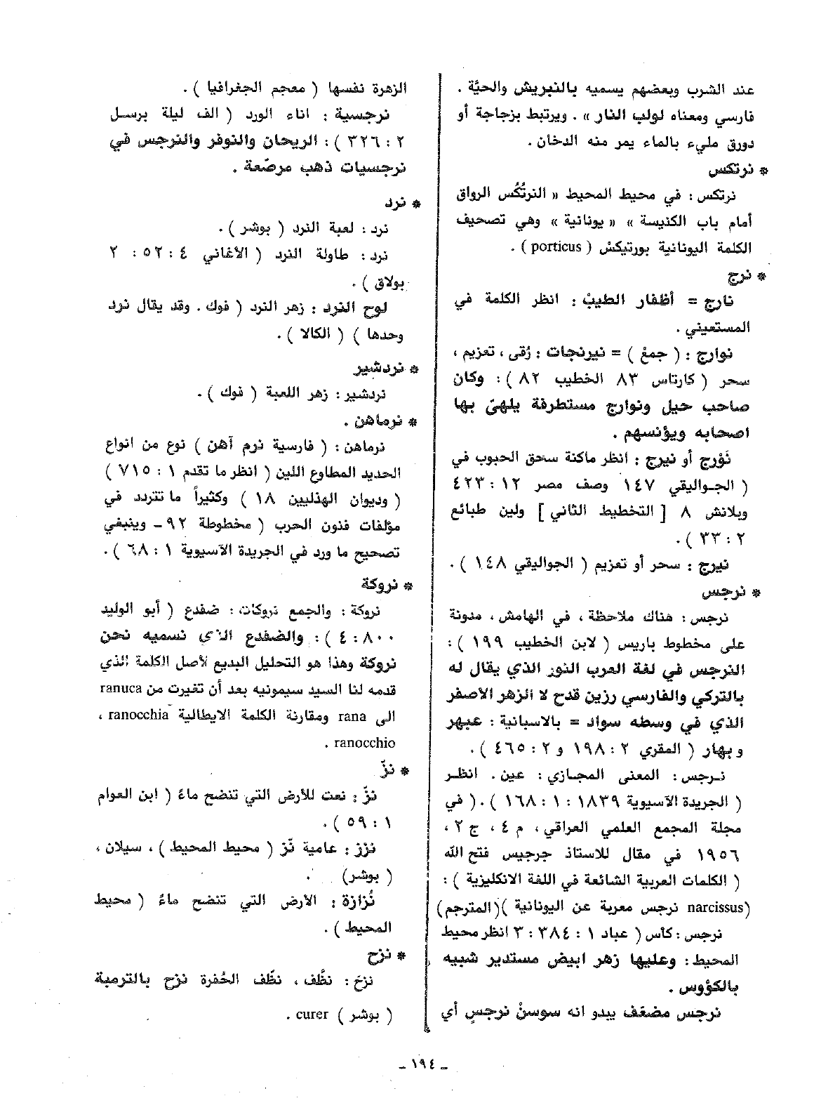 نرجس: المعنى المجازي: عين. انظر (الجريدة الآسيوية 1839: 1: 168). (في مجلة المجمع العلمي العراقي، م 4، ج 2، 1956 في مقال للأستاذ جرجيس فتح الله (الكلمات العربية الشائعة في اللغة الإنكليزية): ( narcissus نرجس معربة عن اليونانية) (المترجم) نرجس: كأس (عباد 1: 384: 3 انظر محيط المحيط: وعليها زهر ابيض مستدير شبيه بالكؤوس.