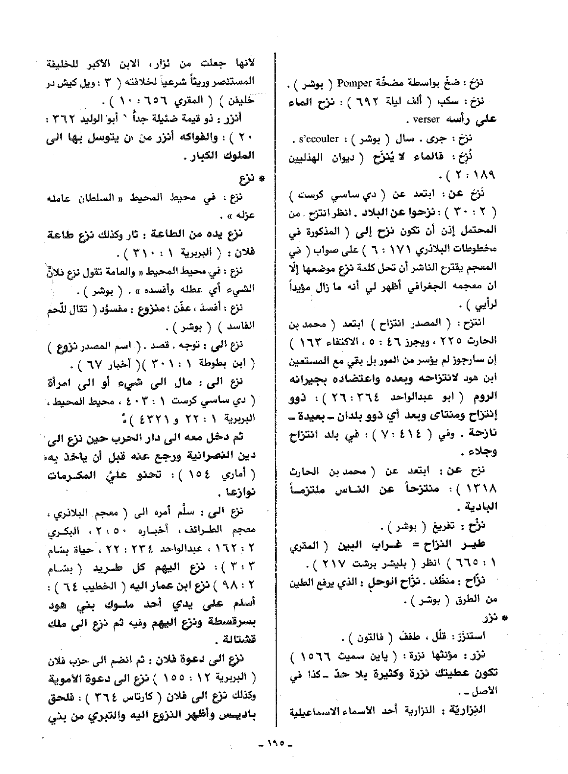 نزر: مؤنثها نزرة: (باين سميث 1566) تكون عطيتك نزرة وكثيرة بلا حد -كذا في الأصل- البزارية: النزارية أحد الأسماء الإسماعيلية لأنها جعلت من نزار، الابن الأكبر للخليفة المستنصر وريثا شرعيا لخلافته (3: ويل كيش در خليفن) (المقري 656: 10).