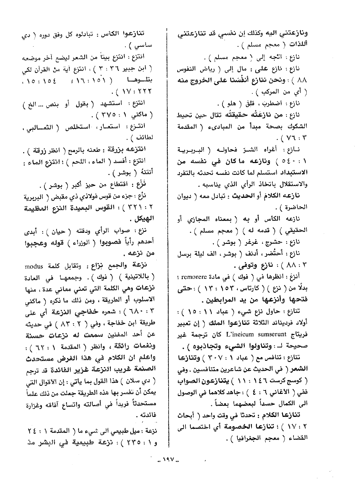 نزعة والجمع نزاع: وتقابل كلمة modus ( وباللاتينية) (فوك). وجمعها في العادة نزعات وهي الكلمة التي تعني معاني عدة، منها الأسلوب أو الطريقة، ومن ذلك ما ذكره (ماكني 3: 680): شعرة خفاجي النزعة أي على طريقة ابن خفاجة، وفي (2: 83) في حديثه عن أحد المغنين سمعت له نزعات حسنة ونغمات رائقة، وانظر (المقدمة 1: 62): واعلم أن الكلام في هذا الغرض مستحدث الصنعة غريب النزعة غزير الفائدة قد ترجم (دي سلان) هذا القول بما يأتي: أن الأقوال التي يمكن أن نفسر بها هذه الطريقة جعلت من ذلك علما مستحدثا فريدا في أصالته واتساع آفاقه وغزارة فائدته.