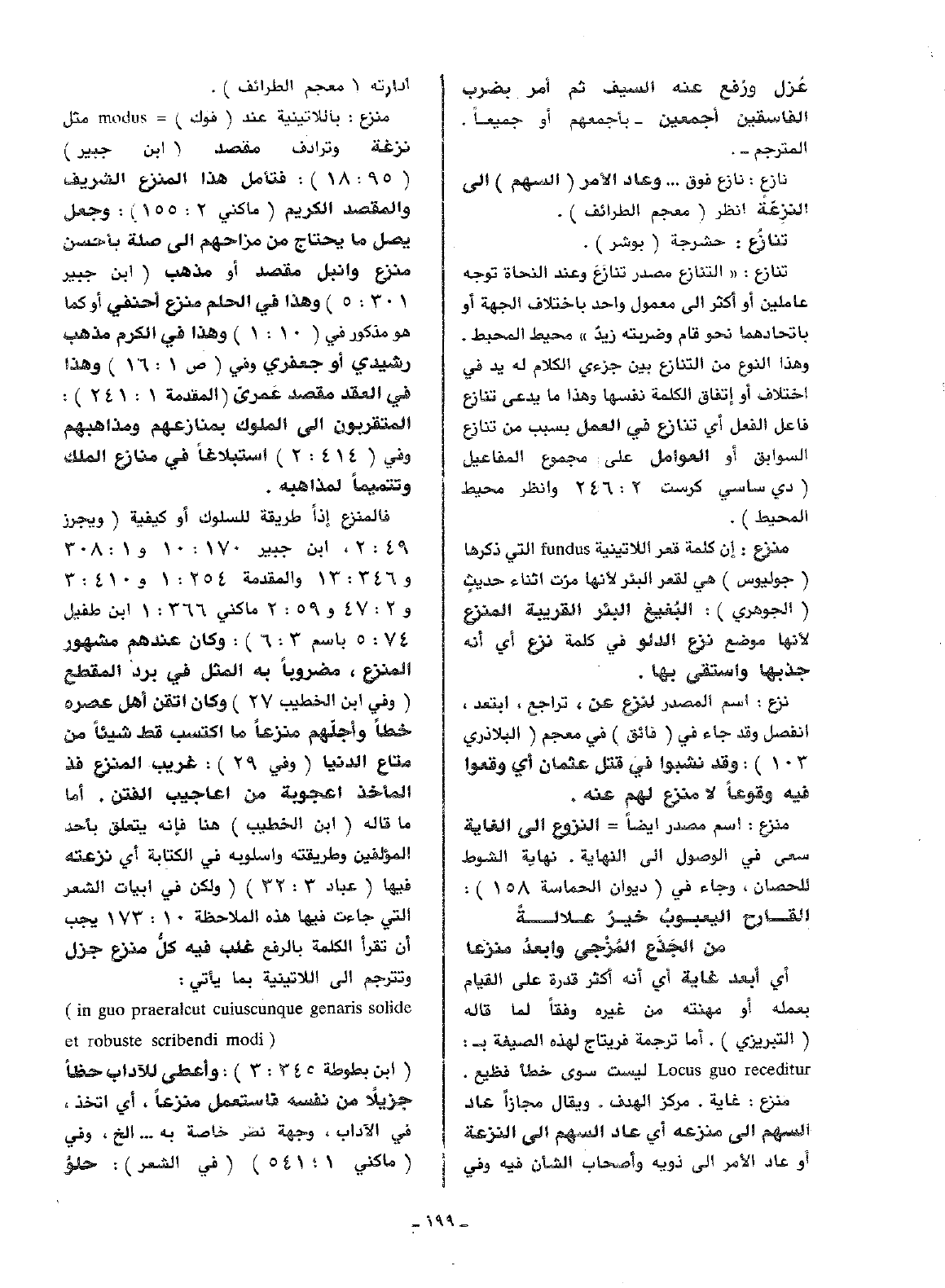 تنازع: (التنازع مصدر تنازع وعند النحاة توجه عاملين أو أكثر إلى معمول واحد باختلاف الجهة أو باتحادهما نحو قام وضربته زيد) محيط المحيط. وهذا النوع من التنازع بين جزئي الكلام له يد في اختلاف أو اتفاق الكلمة نفسها وهذا ما يدعى تنازع فاعل الفعل أي تنازع في العمل بسبب من تنازع السوابق أو العوامل على مجموع المفاعيل (دي ساسي كرست 2: 246 وانظر محيط المحيط).