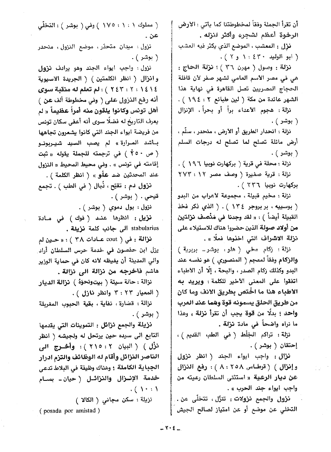 نزول: واجب إيواء الجند وهو يرادف نزول وإنزال (انظر الكلمتين) (الجريدة الآسيوية 1414: 2: 243): لم تعلم له منقبة سوى أنه رفع النزول على (وفي مخطوطة ألف عن) أهل تونس وكانوا يلقون منه أمرا عظيما (لم يعرف التاريخ له فضلا سوى أنه أعفى سكان تونس من فريضة إيواء الجند التي كانوا يشعرون تجاهلها بأشد المرارة) لم يصب السيد شيربونو (ص250) في ترجمته للجملة يقوله (ثبت إقامته في تونس). وفي محيط المحيط (النزول عند المحدثين ضد علو) (انظر الكلمة).