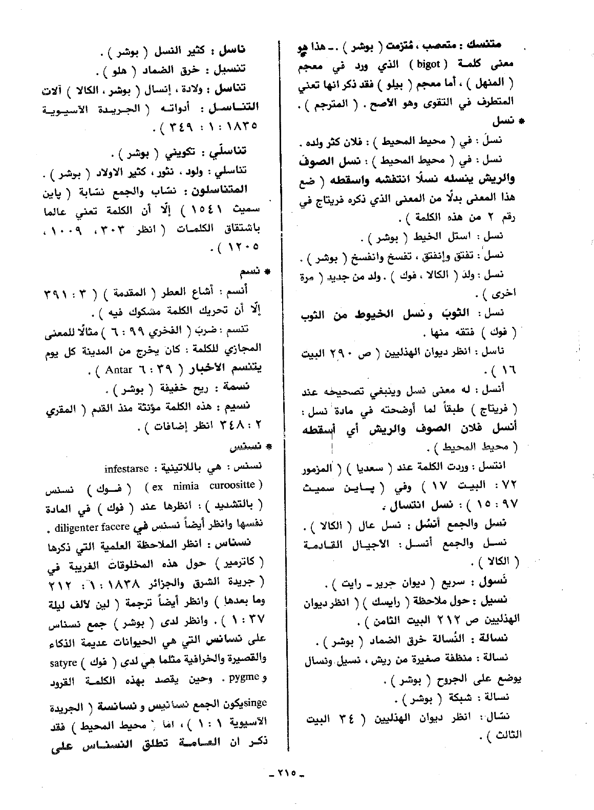 نسناس: انظر الملاحظة العلمية التي ذكرها (كاترمير) حول هذه المخلوقات الغربية في (جريدة الشرق والجزائر 1838: 1: 212 وما بعدها) وانظر أيضا ترجمة (لين لألف ليلة 37: 1). وانظر لدى (بوشر) جمع نسناس على نسانس التي هي الحيوانات عديمة الذكاء والقصيرة والخرافية مثلما هي لدى (فوك) satyre و pygme. وحين يقصد بهذه الكلمة القرود singe يكون الجمع نسانيس ونسناسة (الجريدة الآسيوية 1: 1)، أما (محيط المحيط) فقد ذكر أن العامة تطلق النسناس على