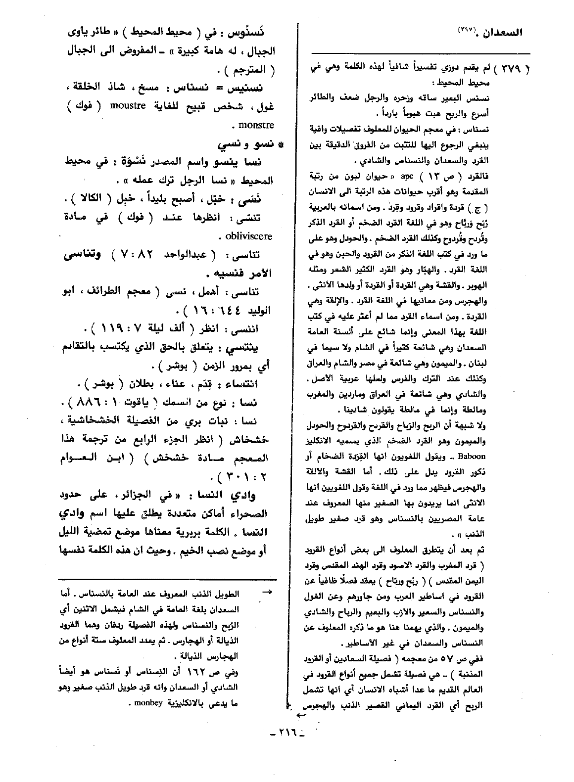 نسنوس: في (محيط المحيط) (طائر يأوي الجبال، له هامة كبيرة) - المفروض إلى الجبال (المترجم).