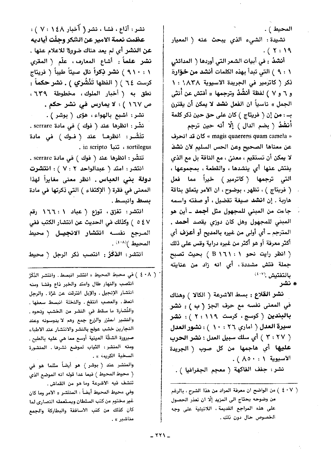 نشر: أذاع، فشا، نشر (أخبار 148: 7): عظمت نعمة الأمير عن الشكر وجلت أياديه عن النشر أي لم يعد هنا كضرورة للإعلام عنها. نشر علما: أشاع المعارف، علم (المقري 1: 910) نشر ذكرا نال صيتا طيبا (فريتاج كرست 64) (الفظها تنشري). نشر حكما: نطق به (أخبار الملوك، مخطوطة 639، ص167): لا يمارس في نشر حكم.