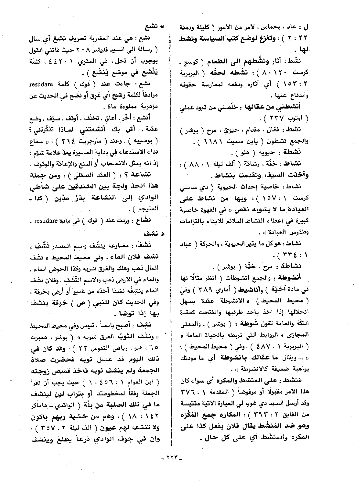 نشط: أثار ونشطهم إلى الطعام (كوسج، كرست 120: 8): نشطه لحقه (البربرية 2: 153) أي أثاره ودفعه لممارسة حقوقه والدفاع عنها.