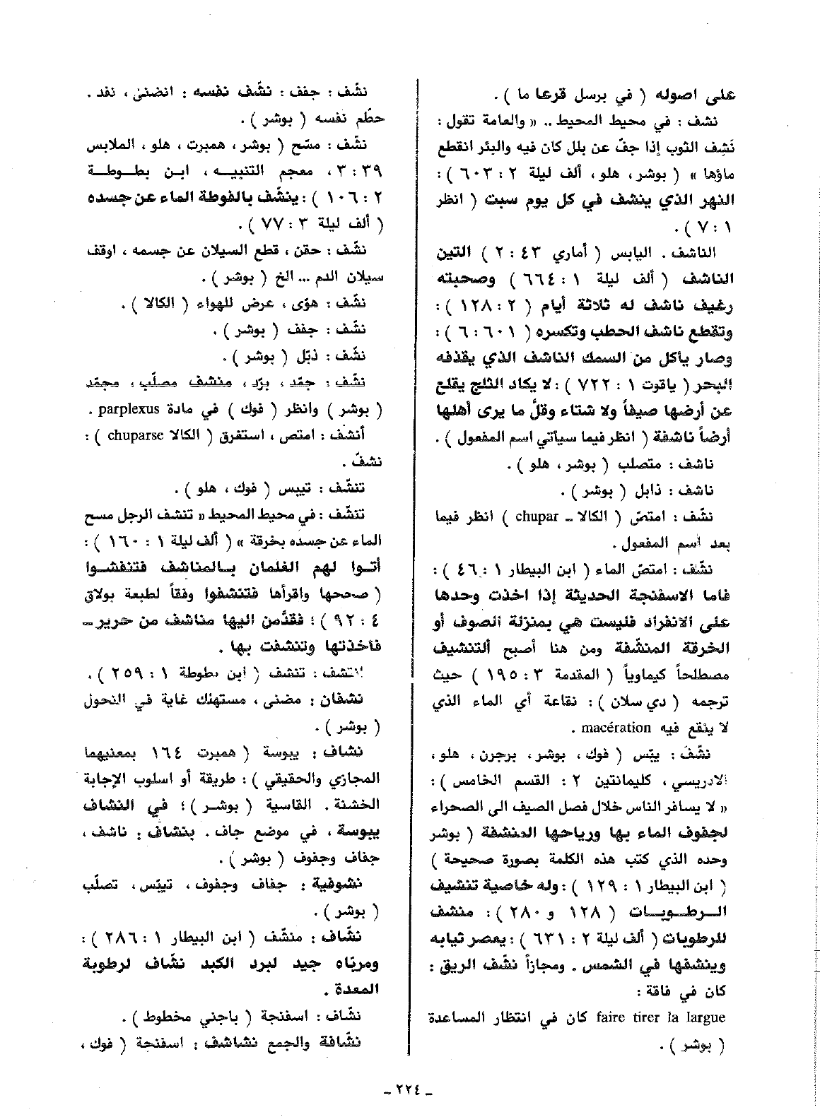 نشف: امتص الماء (ابن البيطار 1: 46): فأما الإسفنجة الحديثة إذا أخذت وحدها على الانفراد فليست هي بمنزلة الصوف أو الخرقة المنشفة ومن هنا أصبح التنشيف مصطلحا كيمياويا (المقدمة 3: 195) حيث تؤجمه (دي سلان): نقاعة أي الماء الذي لا ينقع فيه maceration نشف: يبس (فوك، بوشر، برجرن، هلو، الادريسي، كليمانتين 2: القسم الخامس): (لا يسافر الناس خلال فصل الصيف إلى الصحراء لجفوف الماء بها ورياحها المنشفة (بوشر وحده الذي كتب هذه الكلمة بصورة صحيحة) (ابن البيطار 1: 129): وله خاصية تنشيف الرطوبات (128 و280): منشف للرطوبات (ألف ليلة 2: 631): يعصر ثيابه وينشفها في الشمس. ومجازا نشف الريق: كان في فاقة: faire tirer la largue كان في انتظار المساعدة (بوشر).