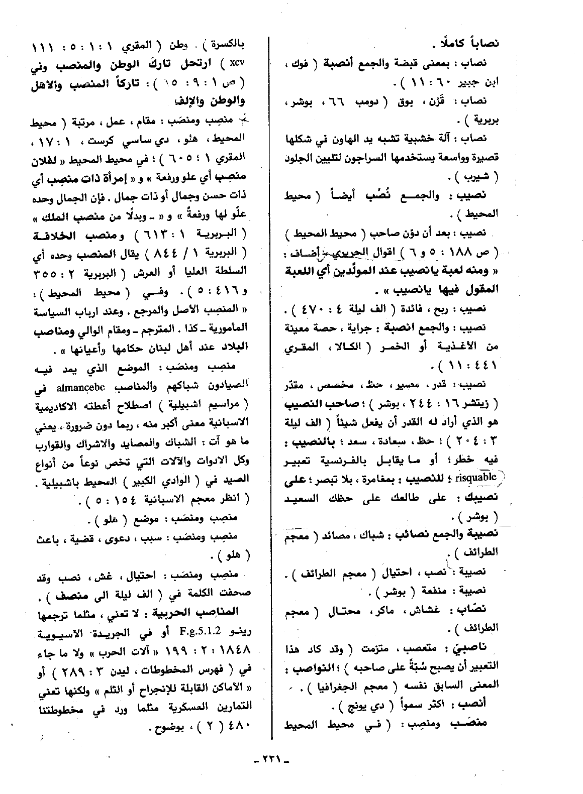 منصب ومنصب: الموضع الذي يمد فيه الصيادون شباكهم والمناصب almancebe في (مراسيم اشبيلية) اصطلاح أعطته الأكاديمية الأسبانية معنى أكبر منه، ربما دون ضرورة، يعني ما هو آت: الشباك والمصايد والاشراك والقوارب وكل الأدوات والآلات التي تخص نوعا من أنواع الصيد في (الوادي الكبير) المحيط باشبيلية. (انظر معجم الأسبانية 154: 5).