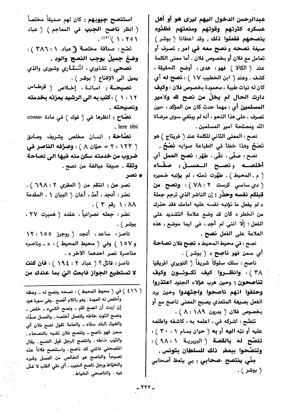 نصح: المعنى الثاني للكلمة عند (فريتاج) هو نصح وهذا خطأ في الطباعة صوابه نصح.