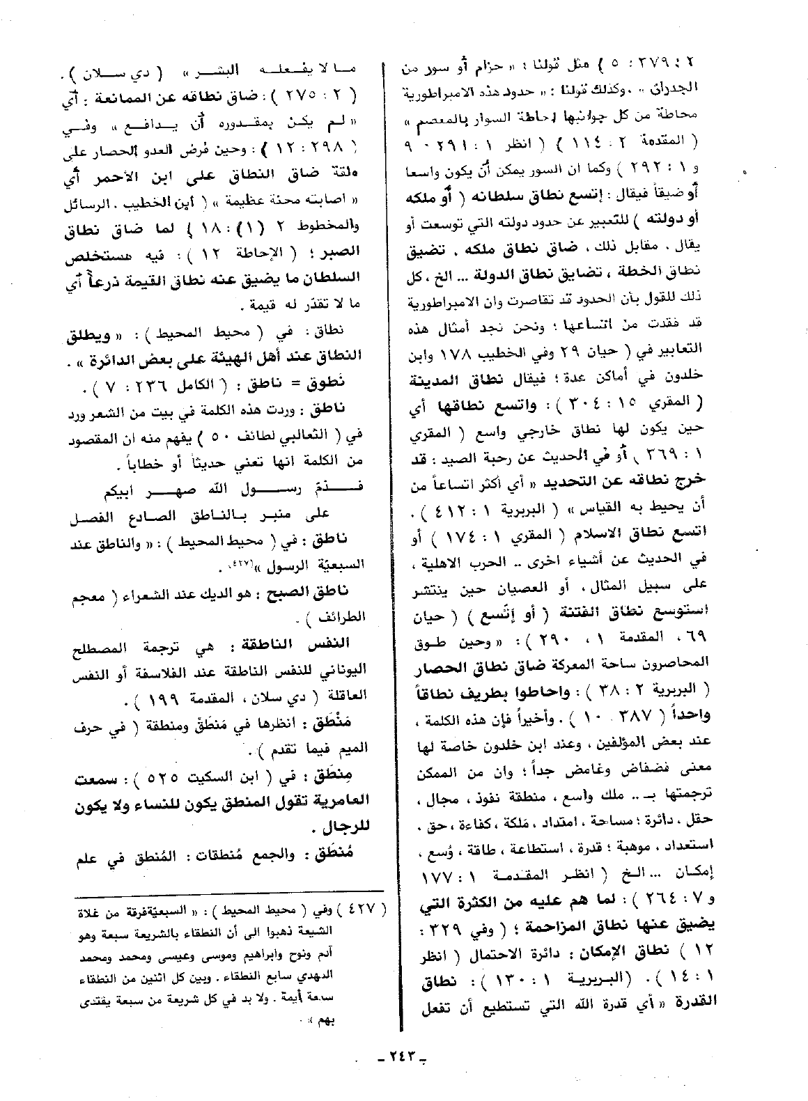 2: 379: 5) مثل قولنا: (حزام أو سور من الجدران). وكذلك قولنا: (حدود هذه الإمبراطورية محاطة من كل جوانبها إحاطة السوار بالمعصم) (المقدمة 2: 114) (انظر 1: 291، 9 و1: 292) وكما أن السور يمكن أن يكون واسعا أو ضيقا فيقال: اتسع نطاق سلطانه (أو ملكه أو دولته) للتعبير عن حدود دولته التي توسعت أو يقال، مقابل ذلك، ضاق نطاق ملكه، تضيق نطاق الخطة، تضايق نطاق الدولة ... الخ، كل ذلك للقول بأن الحدود قد تقاصرت وإن الإمبراطورية قد فقدت من اتساعها؛ ونحن نجد أمثال هذه التعابير في (حيان 29 وفي الخطيب 178 وابن خلدون في أماكن عدة؛ فيقال نطاق المدينة (المقري 15: 304): واتسع نطاقها أي حين يكون لها نطاق خارجي واسع (المقري 1: 369) أو في الحديث عن رحبة الصيد: قد خرج نطاقه عن التحديد (أي أكثر اتساعا من ان يحيط به القياس) (البربرية 1: 412). اتسع نطاق الإسلام (المقري 1: 174) أو في الحديث عن أشياء أخرى .. الحرب الأهلية، على سبيل المثال، أو العصيان حين ينتشر استوسع نطاق الفتنة (أو اتسع) (حيان 69، المقدمة 1، 290): (وحين طوق المحاصرون ساحة المعركة ضاق نطاق الحصار 0البربرية 2: 38): وأحاطوا بطريف نطاقا واحدا (387: 10). وأخيرا فإن هذه الكلمة، عند بعض المؤلفين، وعند ابن خلدون خاصة لها معنى فضفاض وغامض جدا؛ وان من الممكن ترجمتها ب .. ملك واسع، منطقة نفوذ، مجال، حقل، دائرة؛ مساحة، امتداد، ملكة، كفاءة، حق، استعداد، موهبة؛ قدرة، استطاعة، طاقة، وسع، إمكان ... الخ (انظر المقدمة 1: 177 و 7: 264): لما هم عليه من الكثرة التي يضيق عنها نطاق المزاحمة؛ (وفي 329: 12) نطاق الإمكان: دائرة الاحتمال (انظر 1: 14). (البربرية 1: 130). نطاق القدرة (أي قدرة الله تستطيع أن تفعل ما لا تفعله البشر) (دي سلان). (2: 275): ضاق نطاقه عن الممانعة: أي (لم يكن بمقدوره أن يدافع) وفي (298: 12): وحين فرض العدو الحصار على ملقة ضاق النطاق على ابن الأحمر أي (أصابته محنة عظيمة) (ابن الخطيب، الرسائل والمخطوط 2 (1): 18) لما ضاق نطاق الصبر؛ (الإحاطة 12): فيه مستخلص السلطان ما يضيق عنه نطاق القيمة ذرعا أي ما لا تقدر له قيمة.
