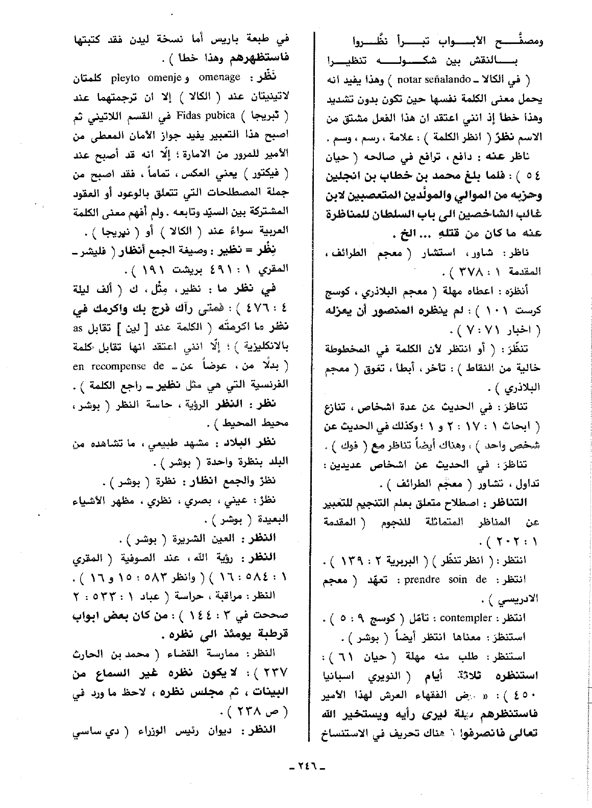 نظر= نظير: وصيغة الجمع أنظار (فليشر- المقري 1: 491 بريشت 191).