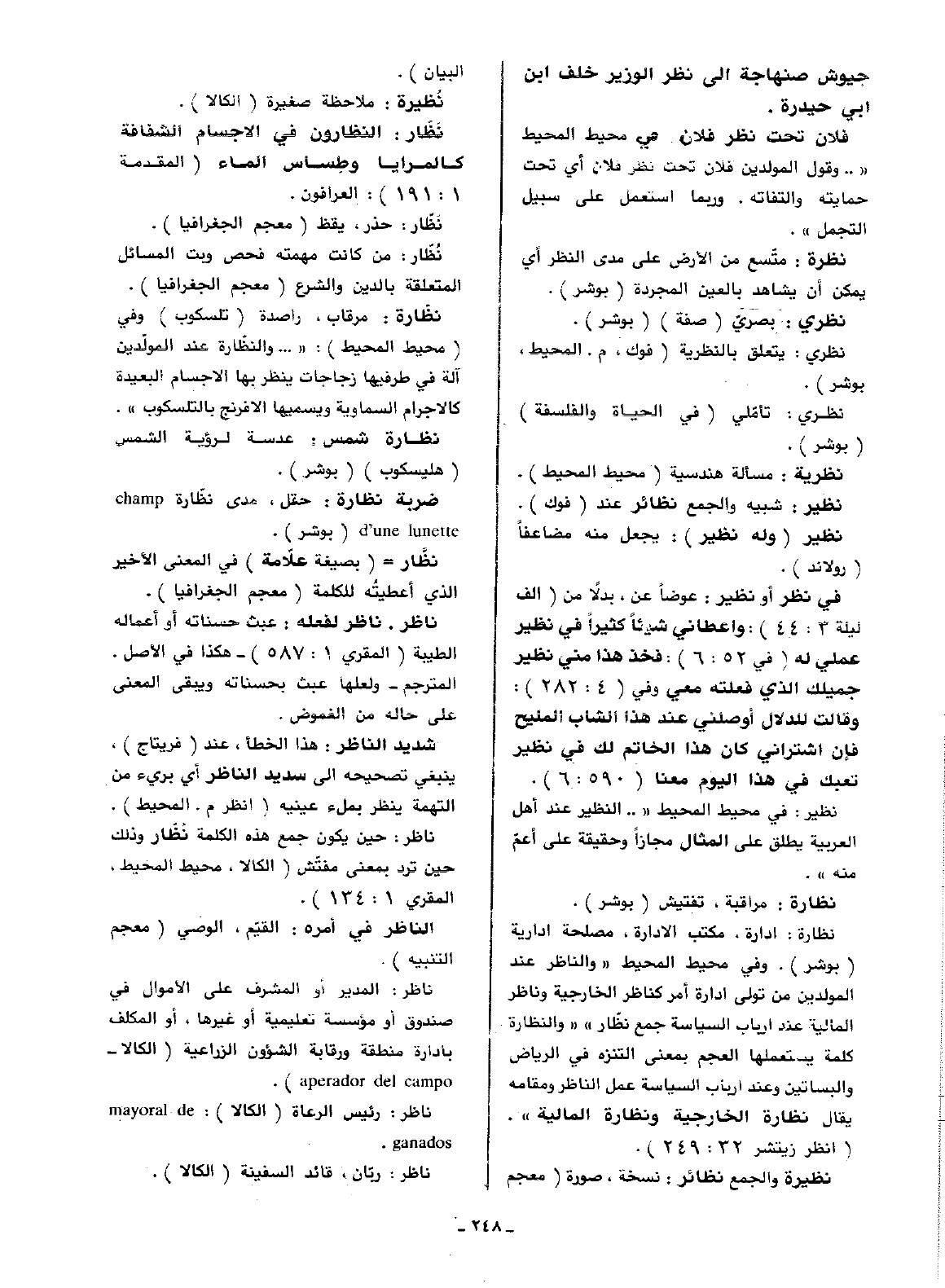 شديد الناظر: هذا الخطأ، عند (فريتاج). ينبغي تصحيحه إلى سديد الناظر أي بريء من التهمة ينظر بملء عينيه (انظر م. المحيط). ناظر: حين يكون جمع هذه الكلمة نظار وذلك حين ترد بمعنى مفتش (الكالا، محيط المحيط، المقري 134:1).