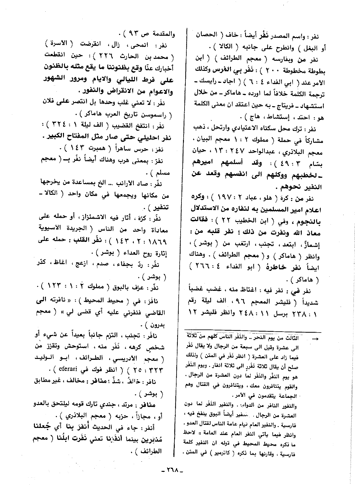 نفر من وبفارسه (معجم الطرائف) (ابن بطوطة مخطوطة 200): نفر بي الفرس وكذلك الأمر عند (أبي الفداء 4: 6) (أجاد -رايسك- ترجمة الكلمة خلافا لما أورده -هاماكر- من خلال استشهاد -فريتاج- به حين أعتقد أن معنى الكلمة هو: احتد، استشاط، هاج).
