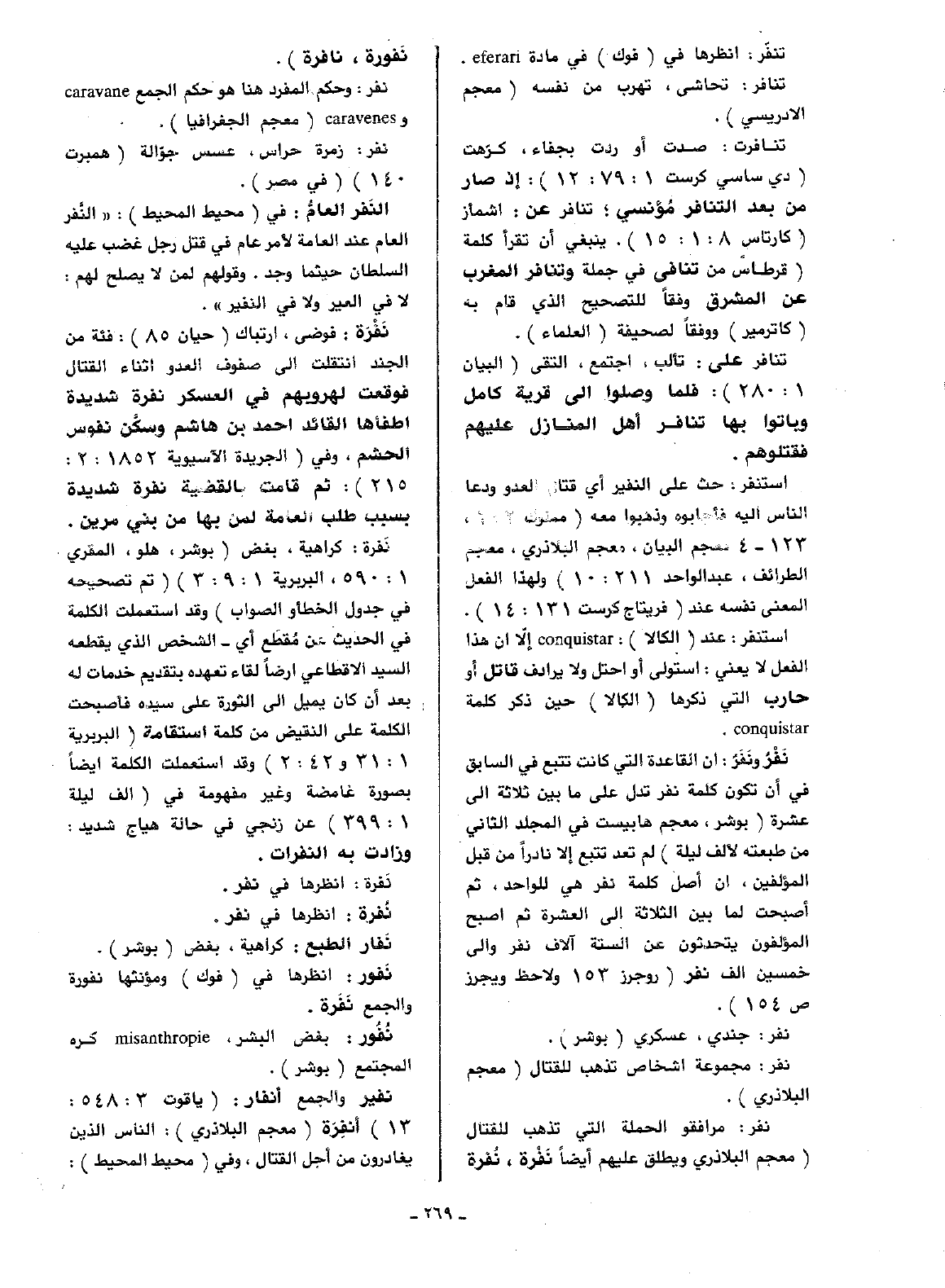 نفرة: كراهية، بغض (بوشر، هلو، المقري 1: 590، البربرية 1: 9: 3) (تم تصحيحه في جدول الخطأ والصواب) وقد استعملت الكلمة في الحديث عن مقطع أي -الشخص الذي يقطعه السيد الإقطاعي أرضا لقاء تعهده بتقديم خدمات له بعد ان كان يميل إلى الثورة على سيده فأصبحت الكلمة على النقيض من كلمة استقامة (البربرية 1: 31 و 42: 2) وقد استعملت الكلمة أيضا بصورة غامضة وغير مفهومة في (ألف ليلة 1: 399) عن زنجي في حالة هياج شديد: وزادت به النفرات.