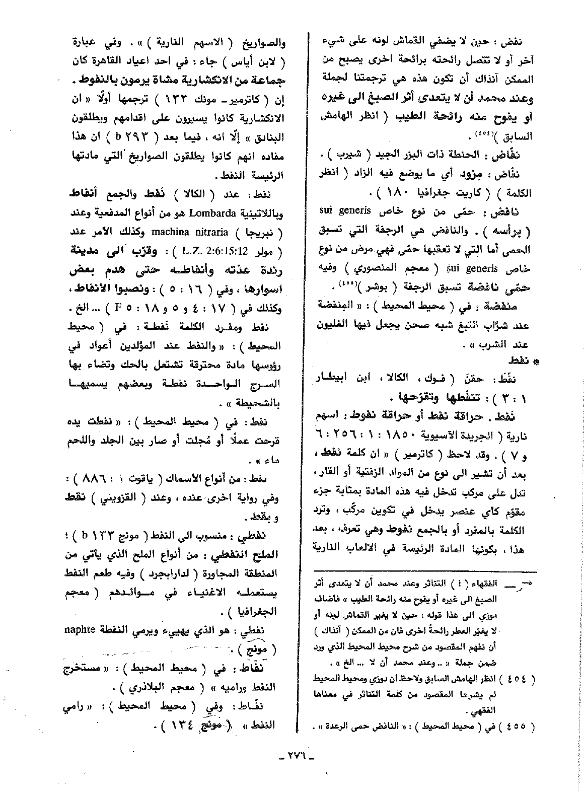 نفط. حراقة نفط أو حراقة نفوط: اسهم نارية (الجريدة الآسيوية 1850: 1: 256: 6 و7). وقد لاحظ (كاترمير) (أن كلمة نفط، بعد أن تشير إلى نوع من المواد الزفتية أو القار، تدل على مركب تدخل فيه هذه المادة بمثابة جزء مقوم كأي عنصر يدخل في تكوين مركب، وترد الكلمة بالمفرد أو بالجمع نفوط وهي تعرف، بعد هذا، بكونها المادة الرئيسة في الألعاب النارية والصواريخ (الاسهم النارية)). وفي عبارة (لابن أياس) جاء: في أحد أعياد القاهرة كان جماعة من الانكشارية مشاة يرمون بالنفوط. إن (كاترمير- مونك 133) ترجمها أولا (أن الانكشارية كانوا يسيرون على أقدامهم ويطلقون البنادق) إلا انه، فيما بعد (293 b) أن هذا مفاده أنهم كانوا يطلقون الصواريخ التي مادتها الرئيسة النفط.