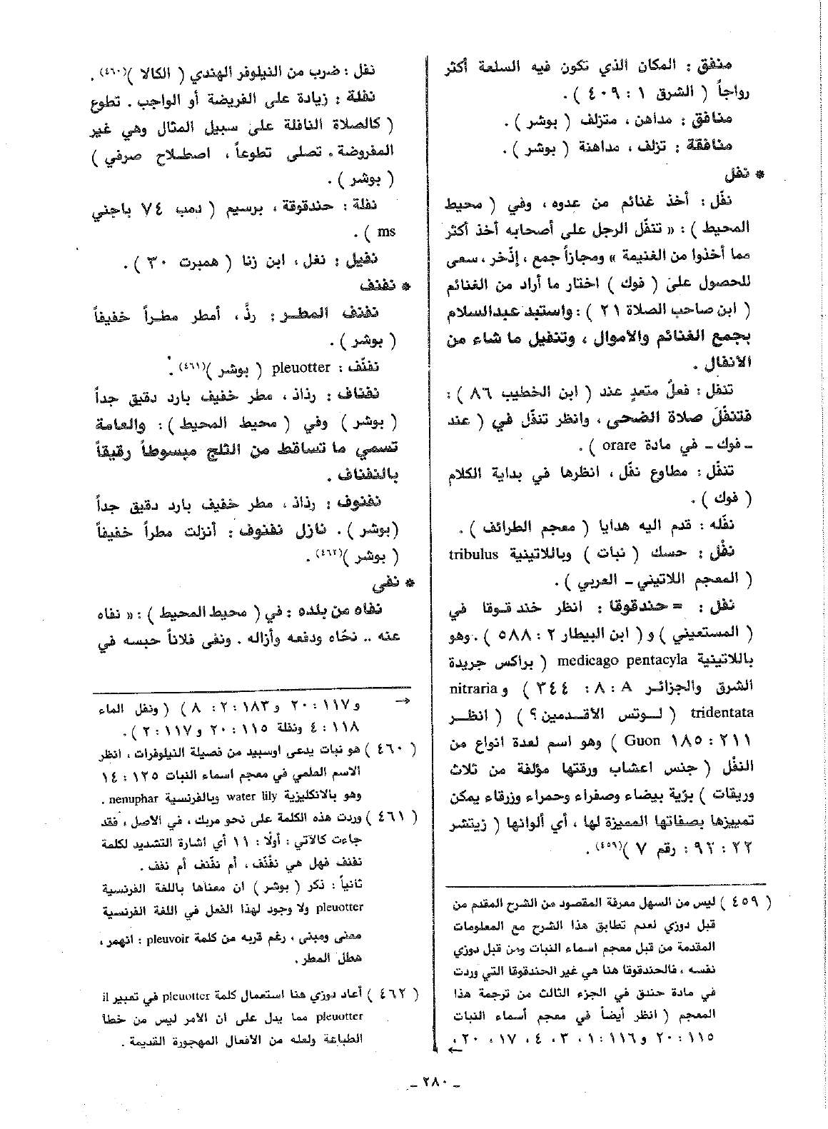 نفل: =حندقوقا: أنظر خندقوقا في (المستعيني) و (ابن البيطار 2: 588). وهو باللاتينية medicago pentacyla ( براكس جريدة الشرق والجزائر A: 8: 344) و tridentata nitraria ( لوتس الأقدمين؟) (انظر 211: 185 Guon) وهو اسم لعدة أنواع من النفل (جنس أعشاب ورقتها مؤلفة من ثلاث وريقات) برية بيضاء وصفراء وحمراء وزرقاء يمكن تمييزها بصفاتها المميزة لها، أي ألوانها (زيتشر 22: 92: رقم 7).