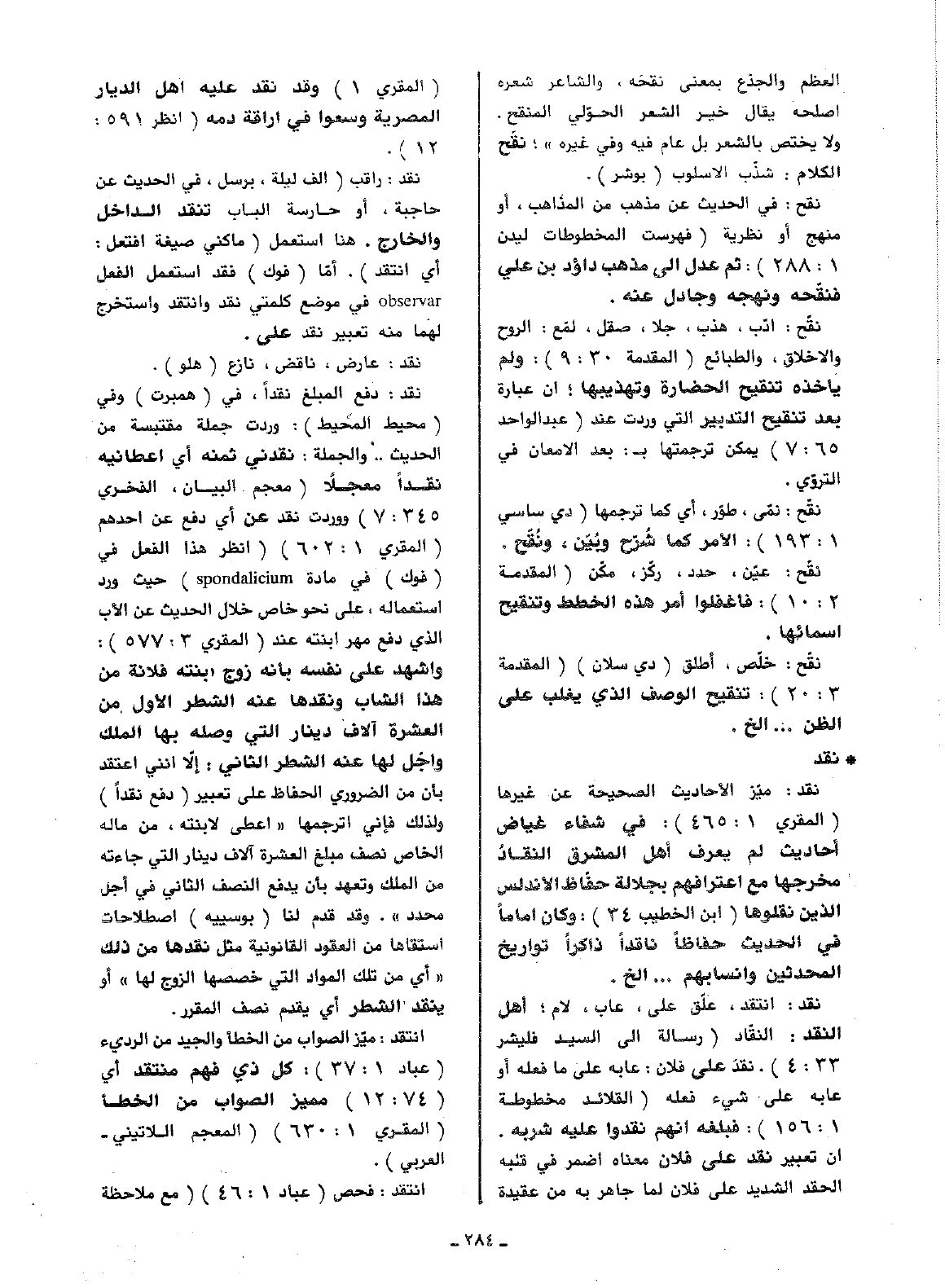 نقد: راقب (ألف ليلة، برسل، في الحديث عن حاجبه، أو حارسه الباب تنقد الداخل والخارج. هنا استعمل (ماكني صيغة افتعل: أي انتقد). أما (فوك) فقد استعمل الفعل observar في موضع كلمتي نقد وانتقد واستخرج لهما منه تعبير نقد على.