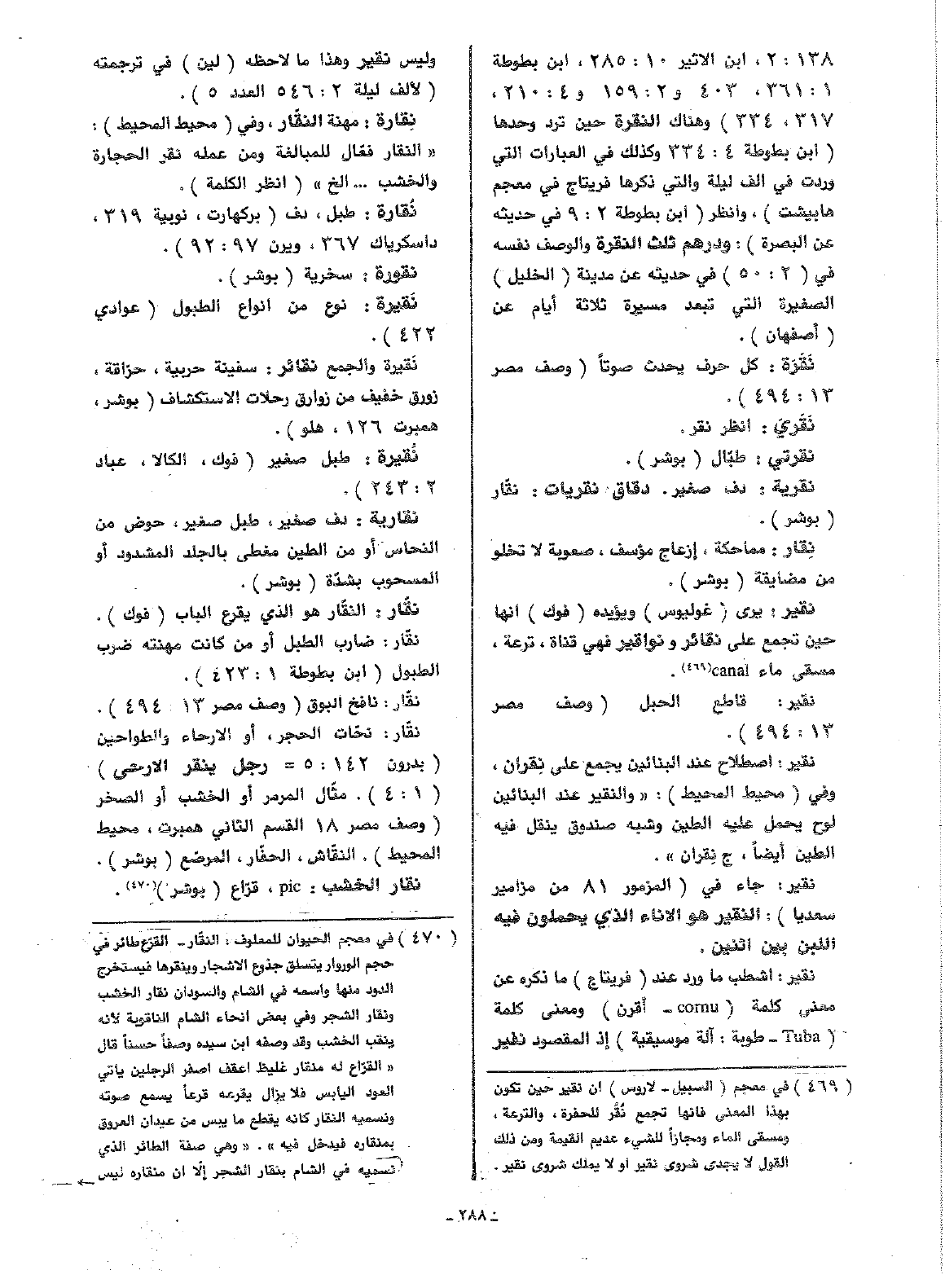 نقير: اشطب ما ورد عند (فريتاج) ما ذكره عن معنى كلمة ( cornu - اقرن) ومعنى كلمة ( Tuba - طوبة: آلة موسيقية) إذ المقصود نفير وليس نقير وهذا ما لاحظه (لين) في ترجمته) (ألف ليلة 2: 546 العدد 5).