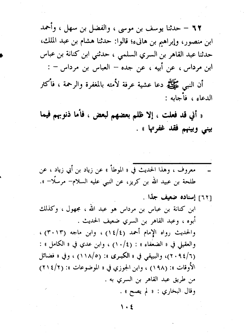 62 - حَدَّثَنَا يُوسُفُ بْنُ مُوسَى، وَالْفَضْلُ بْنُ سَهْلٍ، وَأَحْمَدُ بْنُ مَنْصُورٍ، وَإِبْرَاهِيمُ بْنُ هَانِئٍ، قَالُوا: حَدَّثَنَا هِشَامُ بْنُ عَبْدِ الْمَلِكِ، حَدَّثَنَا عَبْدُ الْقَاهِرِ بْنُ السُّرِّيِّ السُّلَمِيُّ، حَدَّثَنِي ابْنُ كِنَانَةَ بْنُ عَبَّاسِ بْنِ مِرْدَاسٍ، عَنْ أَبِيهِ، عَنْ جَدِّهِ الْعَبَّاسِ بْنِ مِرْدَاسٍ، أَنَّ النَّبِيَّ صَلَّى اللهُ عَلَيْهِ وَسَلَّمَ دَعَا عَشِيَّةُ عَرَفَةَ لِأُمَّتِهِ بِالْمَغْفِرَةِ وَالرَّحْمَةِ، فَأَكْثَرَ الدُّعَاءَ، فَأَجَابَهُ: «§إِنِّي قَدْ فَعَلْتُ، إِلَّا ظَلَمَ بَعْضِهِمْ لِبَعْضٍ، فَأَمَّا ذُنُوبُهُمْ فِيمَا بَيْنِي وَبَيْنَهُمْ فَقَدْ غَفَرْتُهَا» -[105]- فَقَالَ: أَيْ رَبِّ، إِنَّكَ قَادِرٌ أَنْ تُثِيبَ هَذَا الْمَظْلُومَ خَيْرًا مِنْ مَظْلَمَتِهِ، وَتَغْفِرُ لِهَذَا الظَّالِمِ فَلَمْ يجِبْهُ تِلْكَ الْعَشِيَّةَ، فَلَمَّا كَانَ غَدَاةُ الْمُزْدَلِفَةِ، أَعَادَ الدُّعَاءَ فَأَجَابَهُ اللَّهُ: «إِنِّي قَدْ غَفَرْتُ لَهُمْ» فَتَبَسَّمَ رَسُولُ اللَّهِ صَلَّى اللهُ عَلَيْهِ وَسَلَّمَ، فَقَالَ بَعْضُ أَصْحَابِهِ: يَا رَسُولَ اللَّهِ تَبَسَّمْتَ فِي سَاعَةٍ مَا كُنْتَ تَبْتَسِمُ فِيهَا قَالَ: تَبَسَّمْتُ مِنْ عَدُوِّ اللَّهِ إِبْلِيسَ، أَنَّهُ لَمَّا عَلِمَ أَنَّ اللَّهَ عَزَّ وَجَلَّ قَدِ اسْتَجَابَ لِي فِي أُمَّتِي، أَهْوَى يَدْعُو بِالْوَيْلِ وَالثُّبُورِ، وَيَحْثُو التُّرَابَ عَلَى رَأْسِهِ
