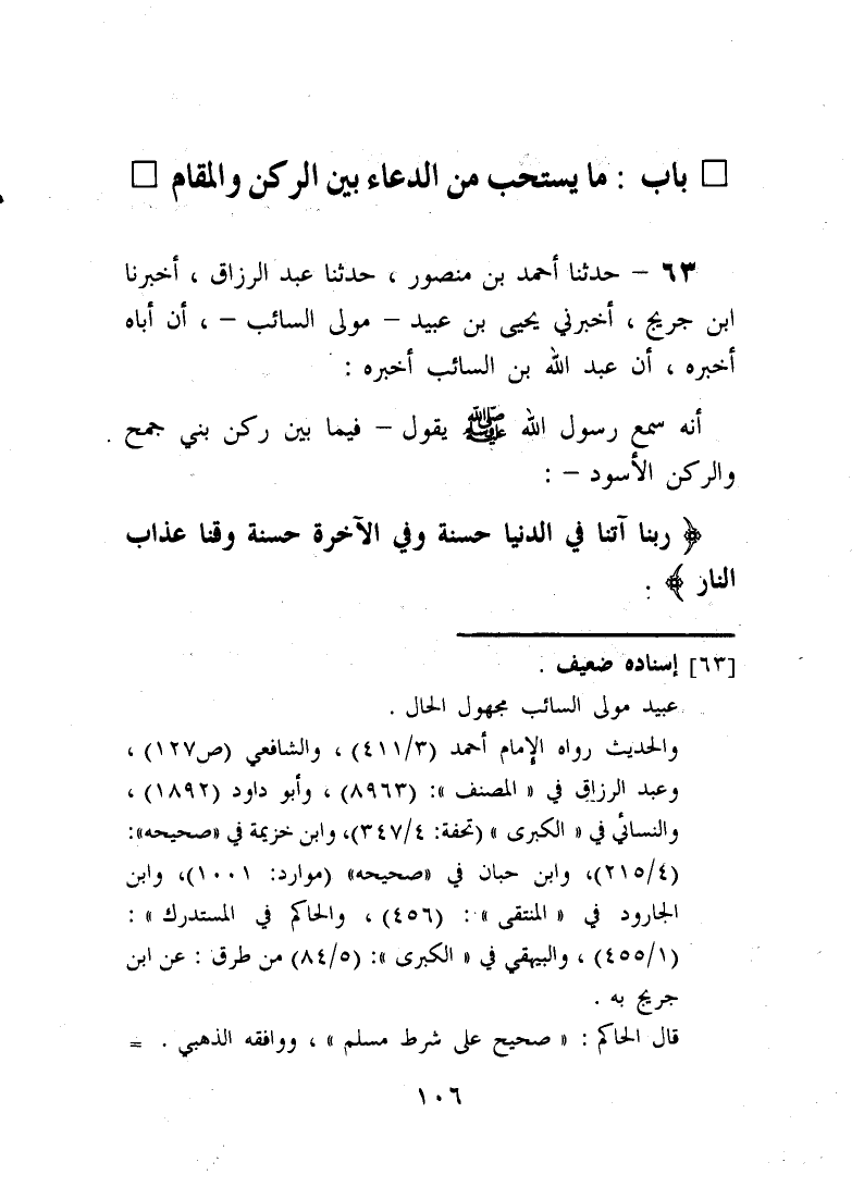 63 - حَدَّثَنَا أَحْمَدُ بْنُ مَنْصُورٍ، حَدَّثَنَا عَبْدُ الرَّزَّاقِ، أَخْبَرَنَا ابْنُ جُرَيْجٍ، أَخْبَرَنِي يَحْيَى بْنُ عُبَيْدٍ، مَوْلَى السَّائِبِ أَنَّ أَبَاهُ، أَخْبَرَهُ، أَنَّ عَبْدَ اللَّهِ بْنَ السَّائِبِ أَخْبَرَهُ: أَنَّهُ، سَمِعَ رَسُولَ اللَّهِ صَلَّى اللهُ عَلَيْهِ وَسَلَّمَ يَقُولُ فِيمَا بَيْنَ رُكْنِ بَنِي جُمَحَ وَالرُّكْنِ الْأَسْوَدِ: " {§رَبَّنَا آتِنَا فِي الدُّنْيَا حَسَنَةً، وَفِي الْآخِرَةِ حَسَنَةً وَقِنَا} [البقرة: 201] عَذَابَ النَّارِ " -[107]-