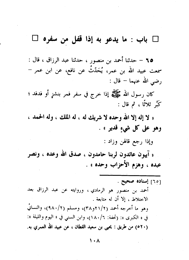 65 - حَدَّثَنَا أَحْمَدُ بْنُ مَنْصُورٍ، حَدَّثَنَا عَبْدُ الرَّزَّاقِ قَالَ: سَمِعْتُ عُبَيْدَ اللَّهِ بْنَ عُمَرَ، يُحَدِّثُ عَنْ نَافِعٍ، عَنِ ابْنِ عُمَرَ، رَضِيَ اللَّهُ عَنْهُمَا قَالَ: كَانَ رَسُولُ اللَّهِ صَلَّى اللهُ عَلَيْهِ وَسَلَّمَ إِذَا خَرَجَ فِي سَفَرٍ فَمَرَّ بِنَشَزٍ أَوْ فَدْفَدٍ، كَبَّرَ ثَلَاثًا ثُمَّ قَالَ: «§لَا إِلَهَ إ لَا اللَّهُ وَحْدَهُ لَا شَرِيكَ لَهُ، لَهُ الْمَلِكُ وَلَهُ الْحَمْدُ، وَهُوَ عَلَى كُلِّ شئٍ قَدِيرٌ» وَإِذَا رَجَعَ قَالَهُنَّ وَزَادَ: «آيِبُونَ عَائِدُونَ لِرَبِّنَا حَامِدُونَ، صَدَقَ اللَّهُ وَعْدَهُ، وَنَصَرَ عَبْدَهُ، وَهَزَمَ الْأَحْزَابَ وَحْدَهُ»