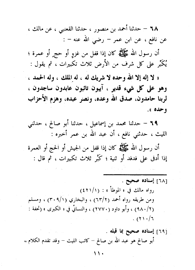 69 - حَدَّثَنَا مُحَمَّدُ بْنُ إِسْمَاعِيلَ، حَدَّثَنَا أَبُو صَالِحٍ، حَدَّثَنِي اللَّيْثُ، حَدَّثَنِي نَافِعٌ، أَنَّ عَبْدَ اللَّهِ بْنَ عُمَرَ، أَخْبَرَهُ: أَنَّ رَسُولَ اللَّهِ صَلَّى اللهُ عَلَيْهِ وَسَلَّمَ كَانَ إِذَا قَفَلَ مِنَ الْجَيْشِ أَوِ الْحَجِّ أَوِ الْعُمْرَةِ إِذَا أَدَفَّى عَلَى فَدْفَدٍ أَوْ ثَنِيَّةٍ، كَبَّرَ ثَلَاثَ تَكْبِيرَاتٍ، ثُمَّ قَالَ: -[111]- «لَا إِلَهَ إِلَّا اللَّهُ وَحْدَهُ» ثُمَّ ذَكَرَ مِثْلَهُ