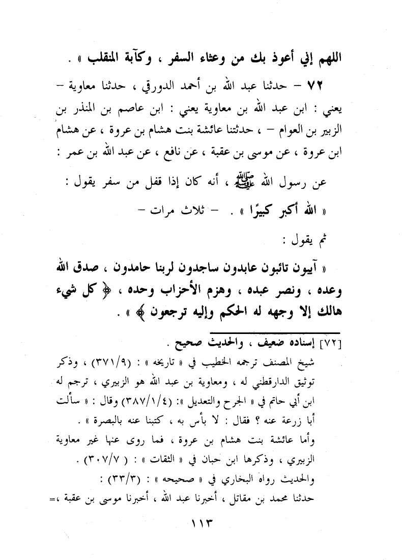 72 - حَدَّثَنَا عَبْدُ اللَّهِ بْنُ أَحْمَدَ الدَّوْرَقِيُّ، حَدَّثَنَا مُعَاوِيَةُ يَعْنِي ابْنَ عَبْدِ اللَّهِ بْنَ مُعَاوِيَةَ يَعْنِي ابْنَ عَاصِمِ بْنِ الْمُنْذِرِ بْنِ الزُّبَيْرِ بْنِ الْعَوَّامِ، حَدَّثَتْنَا عَائِشَةُ بِنْتُ هِشَامِ بْنِ عُرْوَةَ، عَنْ هِشَامِ بْنِ عُرْوَةَ، عَنْ مُوسَى بْنِ عُقْبَةَ، عَنْ نَافِعٍ، عَنْ عَبْدِ اللَّهِ بْنِ عُمَرَ، عَنْ رَسُولِ اللَّهِ صَلَّى اللهُ عَلَيْهِ وَسَلَّمَ، أَنَّهُ كَانَ إِذَا قَفَلَ مِنْ سَفَرِ يَقُولُ: «اللَّهُ أَكْبَرُ كَبِيرًا» ثَلَاثَ مَرَّاتٍ ثُمَّ يَقُولُ: " §آيِبُونَ تَائِبُونَ عَابِدُونَ سَاجِدُونَ لِرَبِّنَا حَامِدُونَ، صَدَقَ اللَّهُ وَعْدَهُ، وَنَصَرَ عَبْدَهُ، وَهَزَمَ الْأَحْزَابَ وَحْدَهُ، {كُلُّ شَيْءٍ هَالِكٌ إِلَّا وَجْهَهُ لَهُ الْحَكَمُ وَإِلَيْهِ تُرْجَعُونَ} [القصص: 88] "