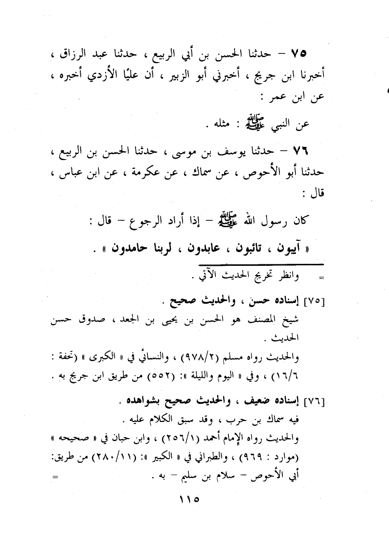 76 - حَدَّثَنَا يُوسُفُ بْنُ مُوسَى، حَدَّثَنَا الْحَسَنُ بْنُ الرَّبِيعِ، حَدَّثَنَا أَبُو الْأَحْوَصِ، عَنْ سِمَاكٍ، عَنْ عِكْرِمَةَ، عَنِ ابْنِ عَبَّاسِ قَالَ: كَانَ رَسُولُ اللَّهِ صَلَّى اللهُ عَلَيْهِ وَسَلَّمَ إِذَا أَرَادَ الرُّجُوعَ قَالَ: «§آيِبُونَ، تَائِبُونَ، عَابِدُونَ، لِرَبِّنَا حَامِدُونَ»