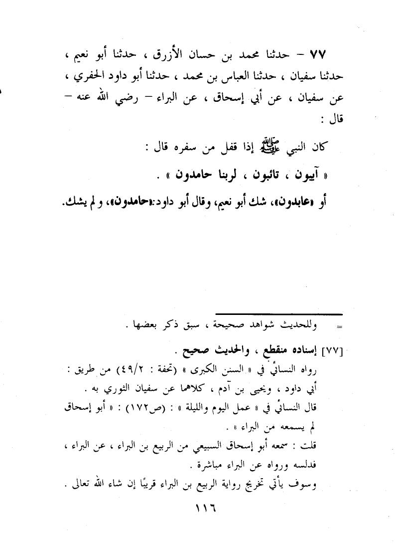 77 - حَدَّثَنَا مُحَمَّدُ بْنُ حَسَّانَ الْأَزْرَقُ، حَدَّثَنَا أَبُو نُعَيْمٍ، حَدَّثَنَا سُفْيَانُ، حَدَّثَنَا الْعَبَّاسُ بْنُ مُحَمَّدٍ، حَدَّثَنَا أَبُو دَاودَ الْحَفَرِيُّ، عَنْ سُفْيَانَ، عَنْ أَبِي إِسْحَاقَ، عَنِ الْبَرَاءِ، رَضِيَ اللَّهُ عَنْهُ قَالَ: كَانَ النَّبِيُّ صَلَّى اللهُ عَلَيْهِ وَسَلَّمَ إِذَا قَفَلَ مِنْ سَفَرِهِ قَالَ: «§آيِبُونَ، تَائِبُونَ، لِرَبِّنَا حَامِدُونَ» أَوْ «عَابِدُونَ» شَكَّ أَبُو نُعَيْمٍ، وَقَالَ أَبُو دَاودَ حَامِدُونَ، وَلَمْ يَشُكَّ